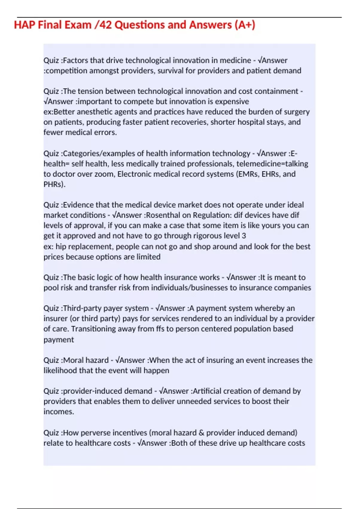 HAP Final Exam /42 Questions and Answers (A+) Quiz :Factors that drive technological innovation in medicine - √Answer :competition amongst providers, survival for providers and patient demand