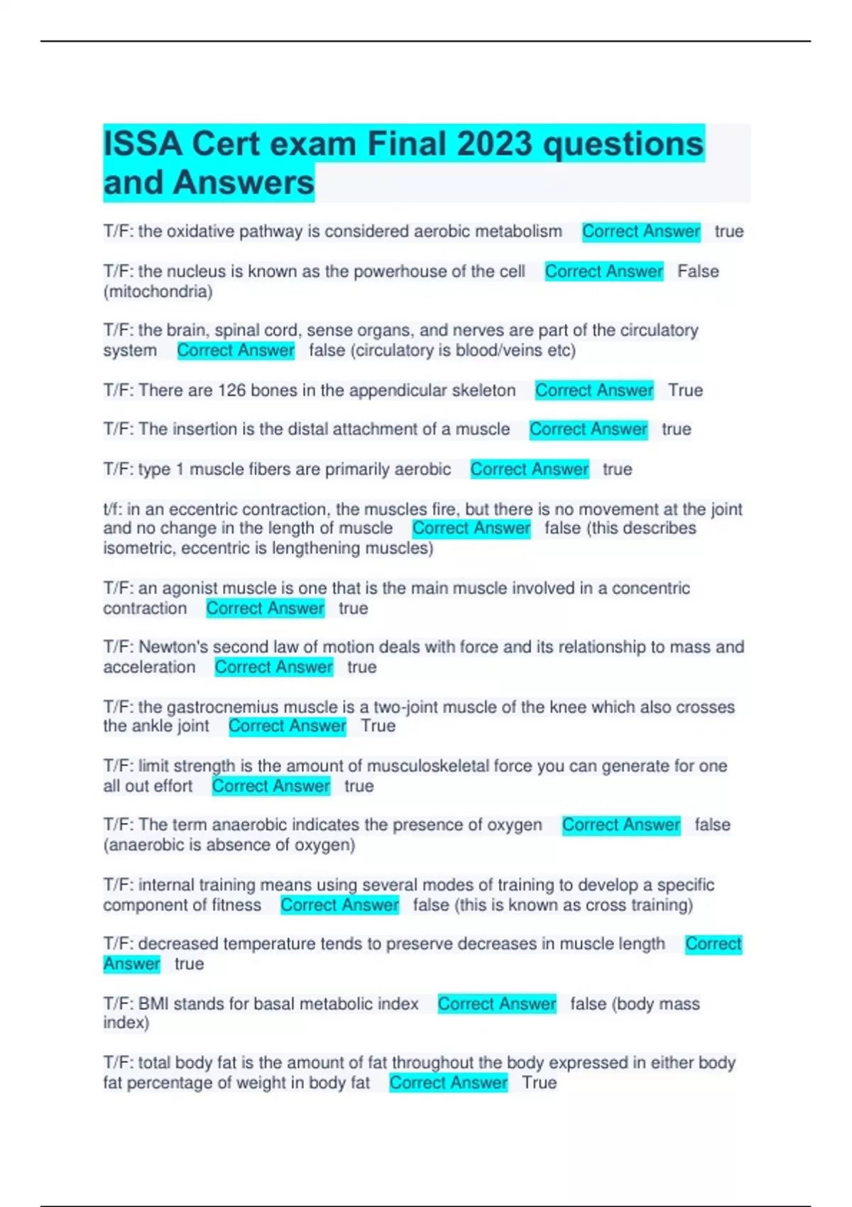ISSA Cert exam Final 2023 questions and Answers T/F: the oxidative pathway is considered aerobic metabolism Correct Answer true T/F: the nucleus is known as the powerhouse of the cell Correct Answer False (mitochondria) T/F: the brain, spinal cord, sense organs, and nerves are part of the circulatory system Correct Answer false (circulatory is blood/veins etc) T/F: There are 126 bones in the appendicular skeleton Correct Answer True T/F: The insertion is the distal attachment of a muscle Correct Answer true T/F: type 1 muscle fibers are primarily aerobic Correct Answer true