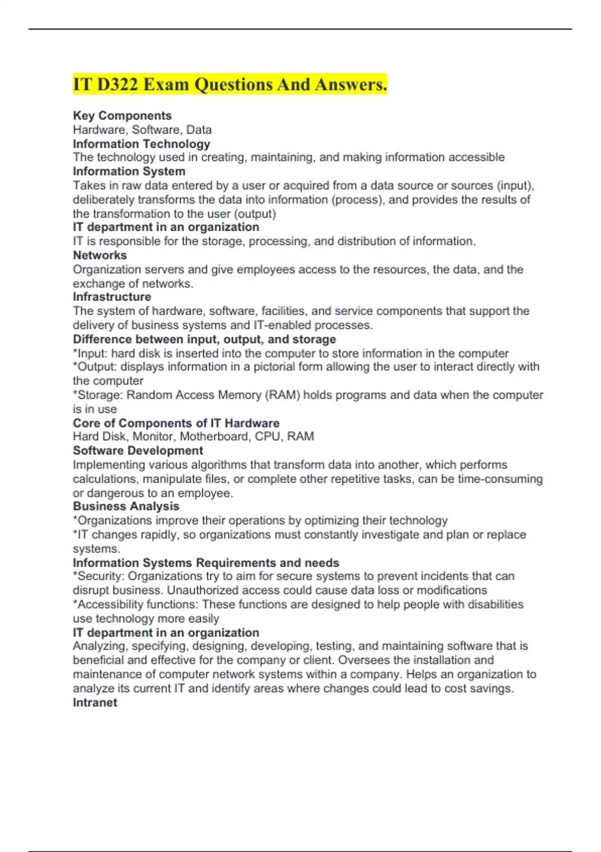 IT D322 Exam Questions And Answers. Key Components Hardware, Software, Data Information Technology The technology used in creating, maintaining, and making information accessible Information System Takes in raw data entered by a user or acquired from a data source or sources (input), deliberately transforms the data into information (process), and provides the results of the transformation to the user (output) IT department in an organization IT is responsible for the storage, processing, and distribution of information. Networks Organization servers and give employees access to the resources, the data, and the exchange of networks. Infrastructure The system of hardware, software, facilities, and service components that support the delivery of business systems and IT-enabled processes. Difference between input, output, and storage *Input: hard disk is inserted into the computer to store information in the computer *Output: displays information in a pictorial form allowing the user to interact directly with the computer *Storage: Random Access Memory (RAM) holds programs and data when the computer is in use Core of Components of IT Hardware Hard Disk, Monitor, Motherboard, CPU, RAM Software Development Implementing various algorithms that transform data into another, which performs calculations, manipulate file