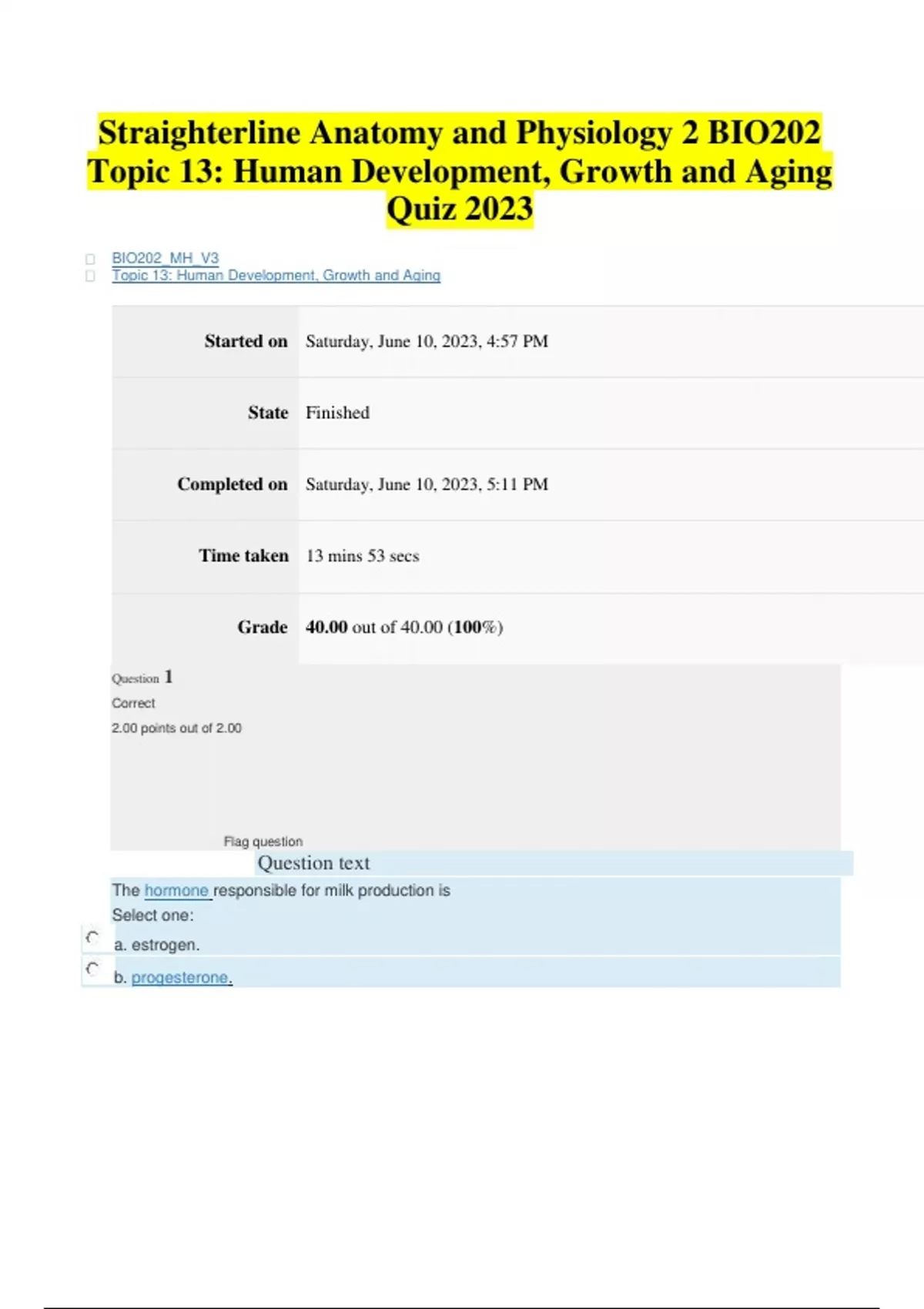 Straighterline Anatomy and Physiology 2 BIO202 Topic 13: Human Development, Growth and Aging Quiz 2023