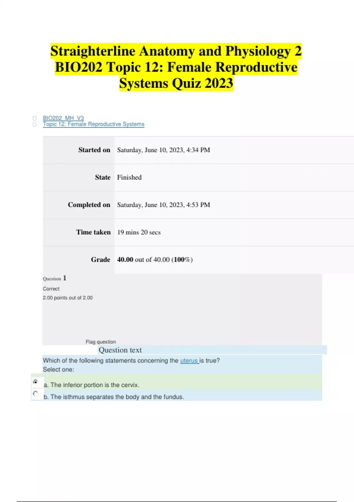 Straighterline Anatomy and Physiology 2 BIO202 Topic 12 Female Reproductive Systems Quiz 2023