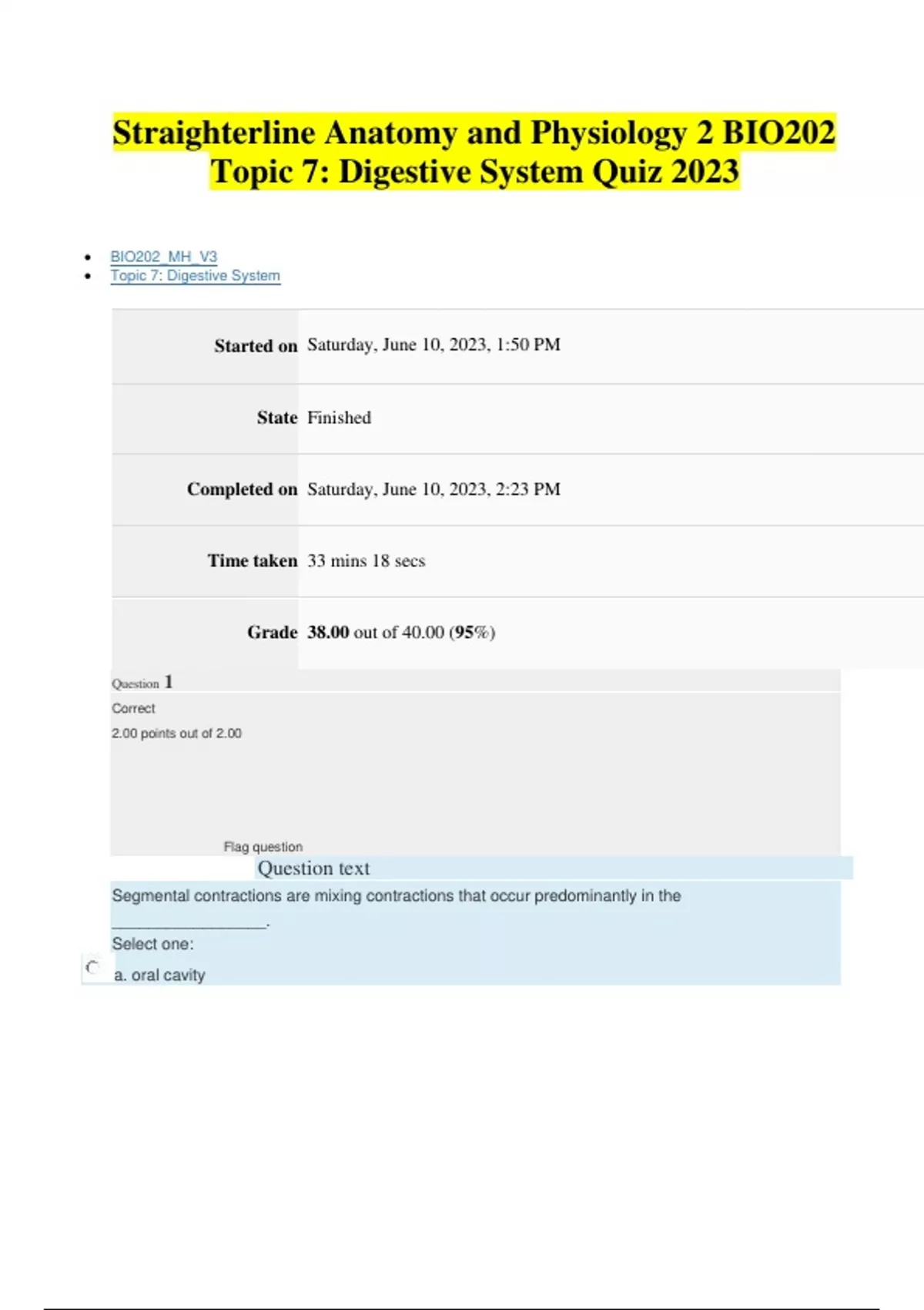 Straighterline Anatomy and Physiology 2 BIO202 Topic 7: Digestive System Quiz 2023
