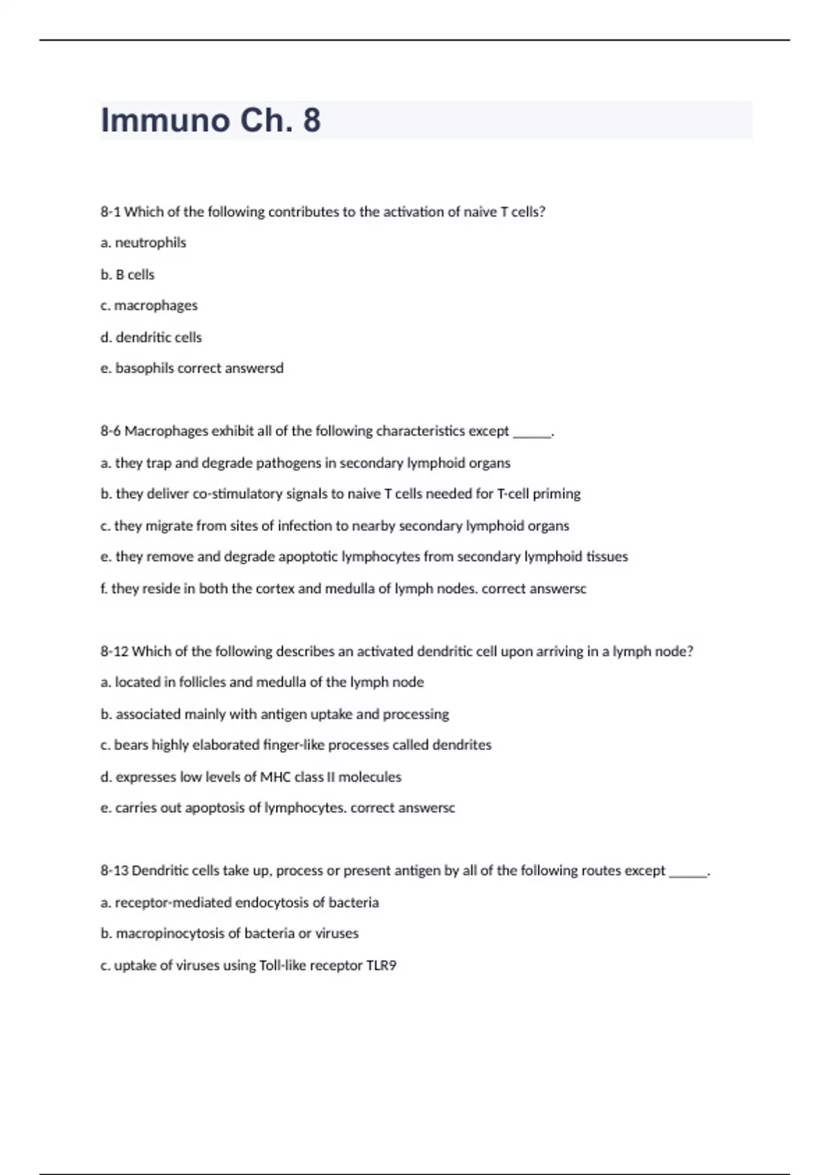 8-1 Which of the following contributes to the activation of naive T cells? a. neutrophils b. B cells c. macrophages d. dendritic cells e. basophils correct answersd 8-6 Macrophages exhibit all of the following characteristics except _____. a. they trap and degrade pathogens in secondary lymphoid organs b. they deliver co-stimulatory signals to naive T cells needed for T-cell priming c. they migrate from sites of infection to nearby secondary lymphoid organs e. they remove and degrade apoptotic lymphocytes from secondary lymphoid tissues f. they reside in both the cortex and medulla of lymph nodes. correct answersc 8-12 Which of the following describes an activated dendritic cell upon arriving in a lymph node? a. located in follicles and medulla of the lymph node b. associated mainly with antigen uptake and processing c. bears highly elaborated finger-like processes called dendrites d. expresses low levels of MHC class II molecules e. carries out apoptosis of lymphocytes. correct answersc 8-13 Dendritic cells take up, process or present antigen by all of the following routes except _____. a. receptor-mediated endocytosis of bacteria b. macropinocytosis of bacteria or viruses c. uptake of viruses using Toll-like receptor TLR9