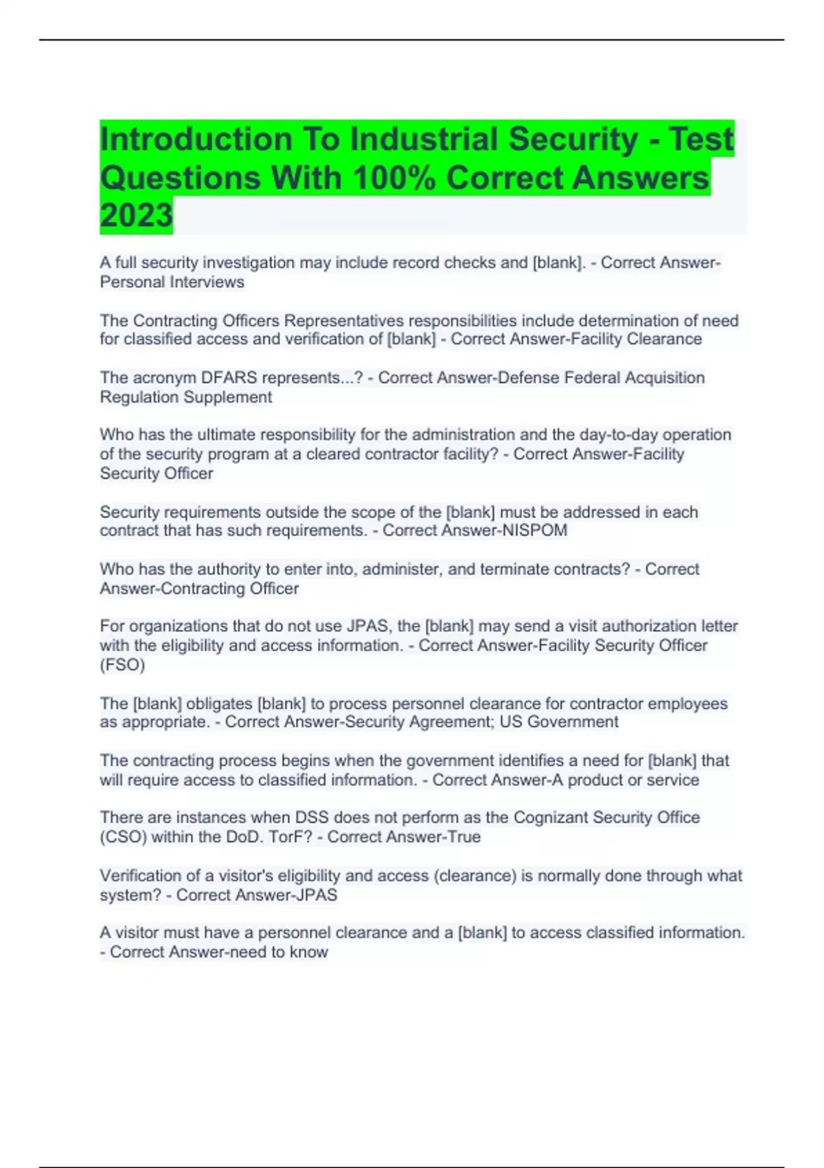 Introduction To Industrial Security - Test Questions With 100% Correct Answers 2023