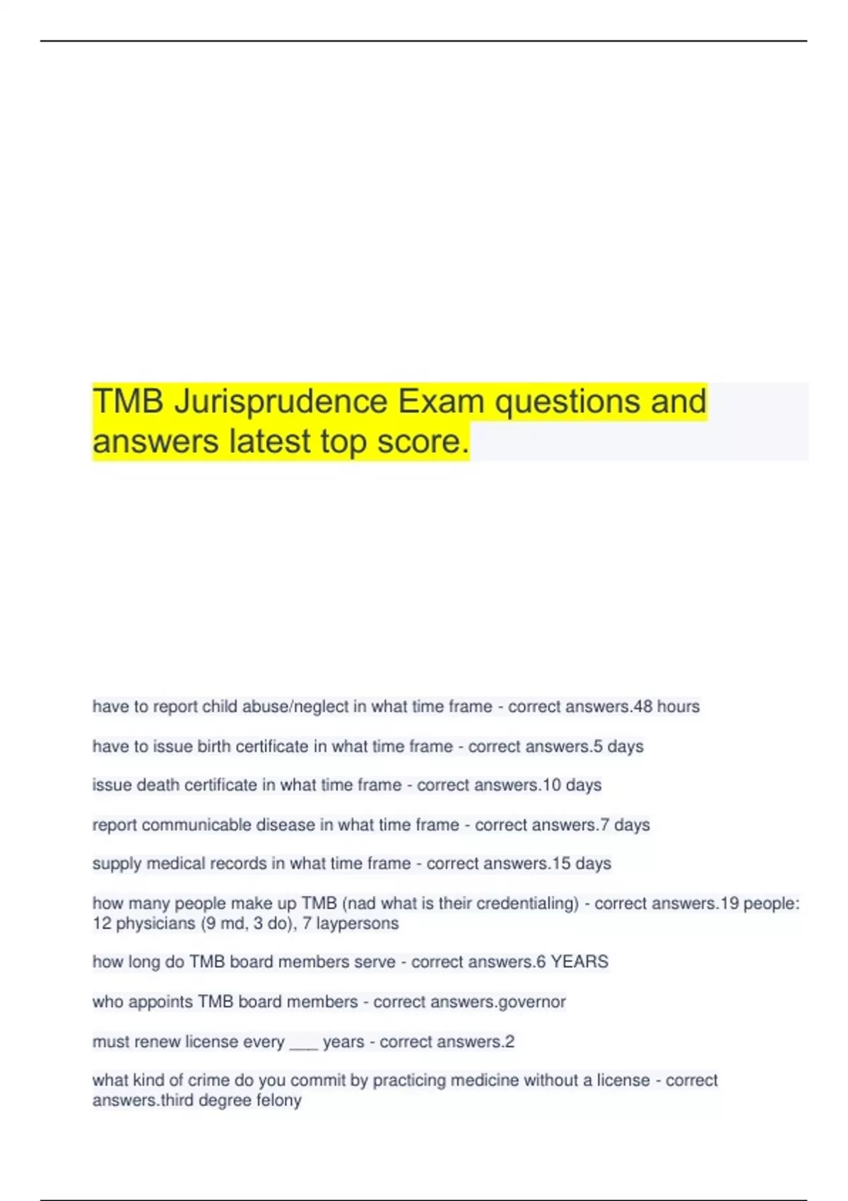 TMB Jurisprudence Exam questions and answers latest top score. have to report child abuse/neglect in what time frame - correct answers.48 hours have to issue birth certificate in what time frame - correct answers.5 days issue death certificate in what time frame - correct answers.10 days report communicable disease in what time frame - correct answers.7 days supply medical records in what time frame - correct answers.15 days how many people make up TMB (nad what is their credentialing) - correct answers.19 people: 12 physicians (9 md, 3 do), 7 laypersons how long do TMB board members serve - correct answers.6 YEARS who appoints TMB board members - correct nor must renew license every ___ years - correct answers.2 what kind of crime do you commit by practicing medicine without a license - correct degree felony if license is expired > ___ days, you are considered to be practicing without a license - correct answers.30 to keep a license, you must complete ___ hours of CME every 2 years - correct answers.48 hours can podiatrists (not MD/DO)admit patients to a hospital - correct NPs and PAs can prescribed which scheduled medications - correct ule III and IV you can delegate outpatient prescriptive authority to ___ (how many) midlevel full time equivalents - correct answers.7 if you work in underserved areas, how many midlevels can work under you - correct limit in underserved areas you must visit the work site every ___ days and be available remotely - correct answers.10 if convicted of a felony, your license is ___ - correct nently revoked what kind of crime do you commit by violating medical practice act (MPA) like dangerous prescribing - correct A misdemeanor what kind of crime do you commit if you get caught a SECOND time violating the medical practice act by dangerous prescribing - correct degree felony you must inform TMB of felonies, drug violations, fraud within ___ days - correct answers.30 being named in ___ lawsuits within a ___ year period automatically generates an official review of your license - correct answers.3, 5 define "infractions" and give examples, punishments? - correct tickets everyone gets: jaywalking, speeding, illegal parking. no effect on ability to practice medicine define misdemeanors and give examples, punishments? - correct crimes: shoplifting, DUI without injury. < 1 year jail with small fine. no affect on civil liberties. define felonies and give examples, punishments? - correct s crimes: assault, murder. jail time > 1 year. lose civil liberties (voting, owning a gun, etc) maximum consequences of class A misdemeanor - correct answers.</= 1 year jail. $4000 fine maximum consequences of class B misdemeanor - correct answers.</= 180 days jail. $2000 fine maximum consequences of class C misdemeanor - correct jail. $500 fine. maximum consequences of capital felony - correct in prison. no financial fine. maximum consequences of 1st degree felony - correct OR 5-99 years in prison. $10,000 fine