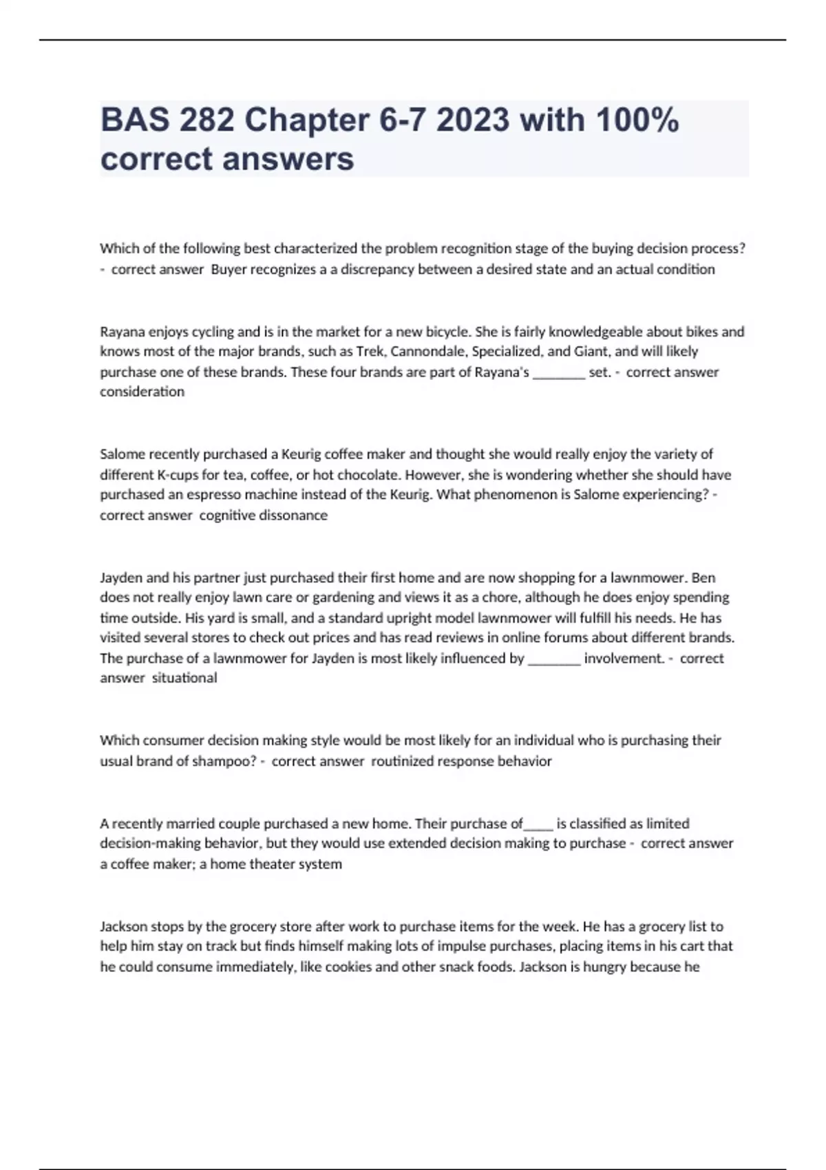 Which of the following best characterized the problem recognition stage of the buying decision process? - correct answer Buyer recognizes a a discrepancy between a desired state and an actual condition Rayana enjoys cycling and is in the market for a new bicycle. She is fairly knowledgeable about bikes and knows most of the major brands, such as Trek, Cannondale, Specialized, and Giant, and will likely purchase one of these brands. These four brands are part of Rayana's _______ set. - correct answer consideration Salome recently purchased a Keurig coffee maker and thought she would really enjoy the variety of different K-cups for tea, coffee, or hot chocolate. However, she is wondering whether she should have purchased an espresso machine instead of the Keurig. What phenomenon is Salome experiencing? - correct answer cognitive dissonance Jayden and his partner just purchased their first home and are now shopping for a lawnmower. Ben does not really enjoy lawn care or gardening and views it as a chore, although he does enjoy spending time outside. His yard is small, and a standard upright model lawnmower will fulfill his needs. He has visited several stores to check out prices and has read reviews in online forums about different brands. The purchase of a lawnmower for Jayden is most likely influenced by _______ involvement. - correct answer situational Which consumer decision making style would be most likely for an individual who is purchasing their usual brand of shampoo? - correct answer routinized response behavior A recently married couple purchased a new home. Their purchase of____ is classified as limited decision-making behavior, but they would use extended decision making to purchase - correct answer a coffee maker; a home theater system