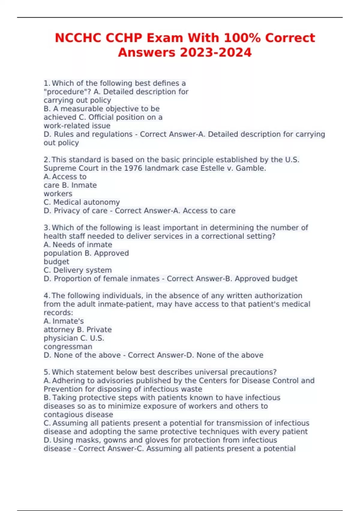NCCHC CCHP Exam With 100% Correct Answers 1. Which of the following best defines a "procedure"? A. Detailed description for carrying out policy B. A measurable objective to be achieved C. Official position on a work-related issue D. Rules and regulations