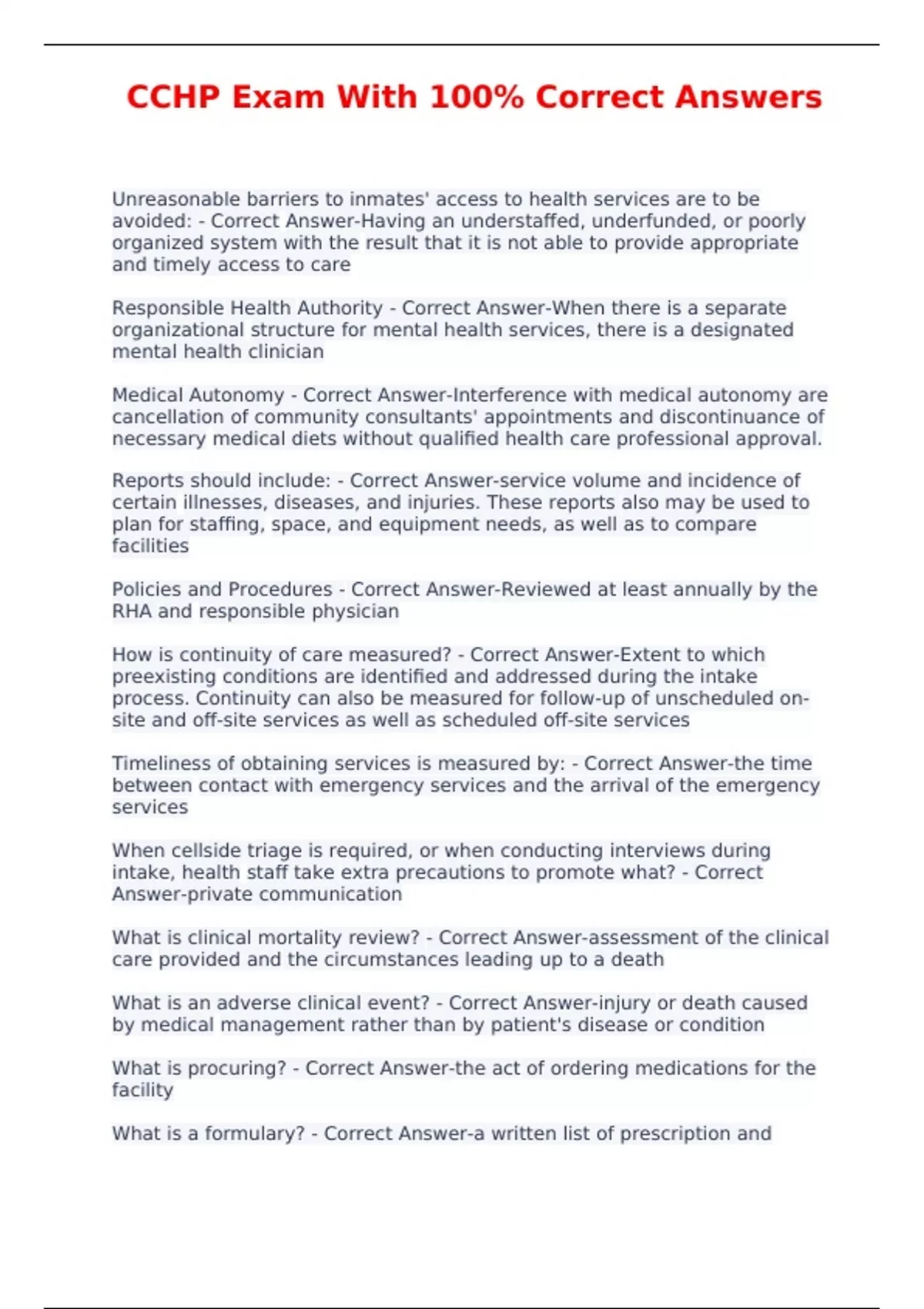 CCHP Exam With 100% Correct Answers Unreasonable barriers to inmates' access to health services are to be avoided: - Correct Answer-Having an understaffed, underfunded, or poorly organized system with the result that it is not able to provide appropriate and timely access to care