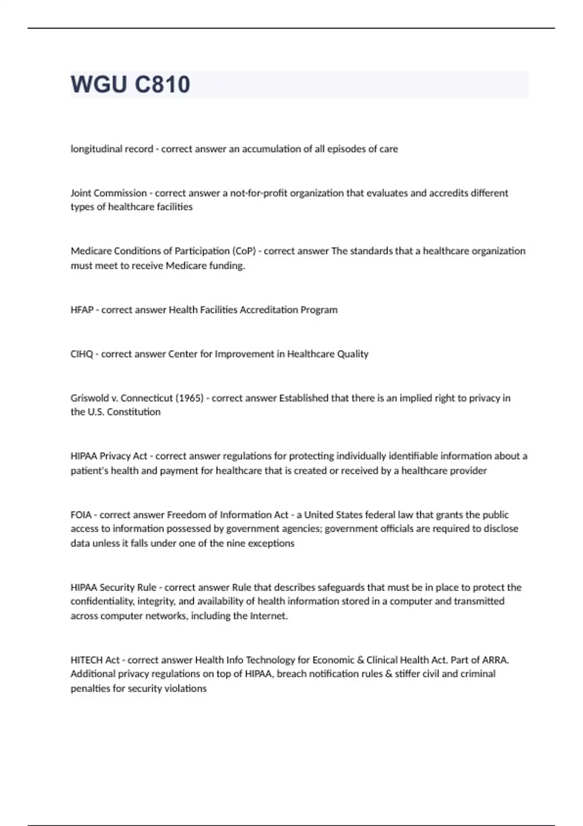WGU C810longitudinal record - correct answer an accumulation of all episodes of care Joint Commission - correct answer a not-for-profit organization that evaluates and accredits different types of healthcare facilities Medicare Conditions of Participation (CoP) - correct answer The standards that a healthcare organization must meet to receive Medicare funding. HFAP - correct answer Health Facilities Accreditation Program CIHQ - correct answer Center for Improvement in Healthcare Quality Griswold v. Connecticut (1965) - correct answer Established that there is an implied right to privacy in the U.S. Constitution HIPAA Privacy Act - correct answer regulations for protecting individually identifiable information about a patient's health and payment for healthcare that is created or received by a healthcare provider FOIA - correct answer Freedom of Information Act - a United States federal law that grants the public access to information possessed by government agencies; government officials are required to disclose data unless it falls under one of the nine exceptions HIPAA Security Rule - correct answer Rule that describes safeguards that must be in place to protect the confidentiality, integrity, and availability of health information stored in a computer and transmitted across computer networks, including the Internet. HITECH Act - correct answer Health Info Technology for Economic & Clinical Health Act. Part of ARRA. Additional privacy regulations on top of HIPAA, breach notification rules & stiffer civil and criminal penalties for security violations ARRA - correct answer American Recovery & Reinvestment Act AKA Stimulus or Recovery Act. $17 billion in incentive through CMS reimbursements to help adopt EHRs. Providers have to show meaningful use of EHR technology FRE - correct answer Federal Rules of Evidence - state the legal health record is considered a business record and admissible in court MPI - correct answer master patient index authenticity - correct answer the reliability of the system on which information is created and stored, and to the information itself authentication - correct answer validates content and proves authorship. In paper records, authentication is accomplished by a handwritten signature or initials, both in ink. Electronic or digital signatures and computer keys are examples of authentication methods in EHRs hospital record retention period required by Medicare CoP - correct answer 5 years MACRA - correct answer Medicare Access and CHIP Reauthorization Act MIPS (Merit-Based Incentive Payment System) - correct answer quality payment program that determines Medicare payment adjustments to providers consent - correct answer permission for something to happen or agreement to do something. general consent - correct answer consent given for all routine services, general diagnostic procedures, medical treatment, & other normal & routine touching informed consent - correct answer An ethical principle requiring that research participants be told enough to enable them to choose whether they wish to participate.