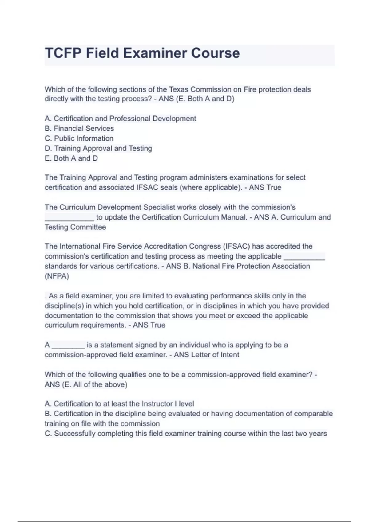 TCFP Field Examiner Course Questions And Answers(A GRADED 100%VERIFIED) Which of the following sections of the Texas Commission on Fire protection deals directly with the testing process? - ANS (E. Both A and D) A. Certification and Professional Development B. Financial Services C. Public Information D. Training Approval and Testing E. Both A and D The Training Approval and Testing program administers examinations for select certification and associated IFSAC seals (where applicable). - ANS True The Curriculum Development Specialist works closely with the commission's ____________ to update the Certification Curriculum Manual. - ANS A. Curriculum and Testing Committee