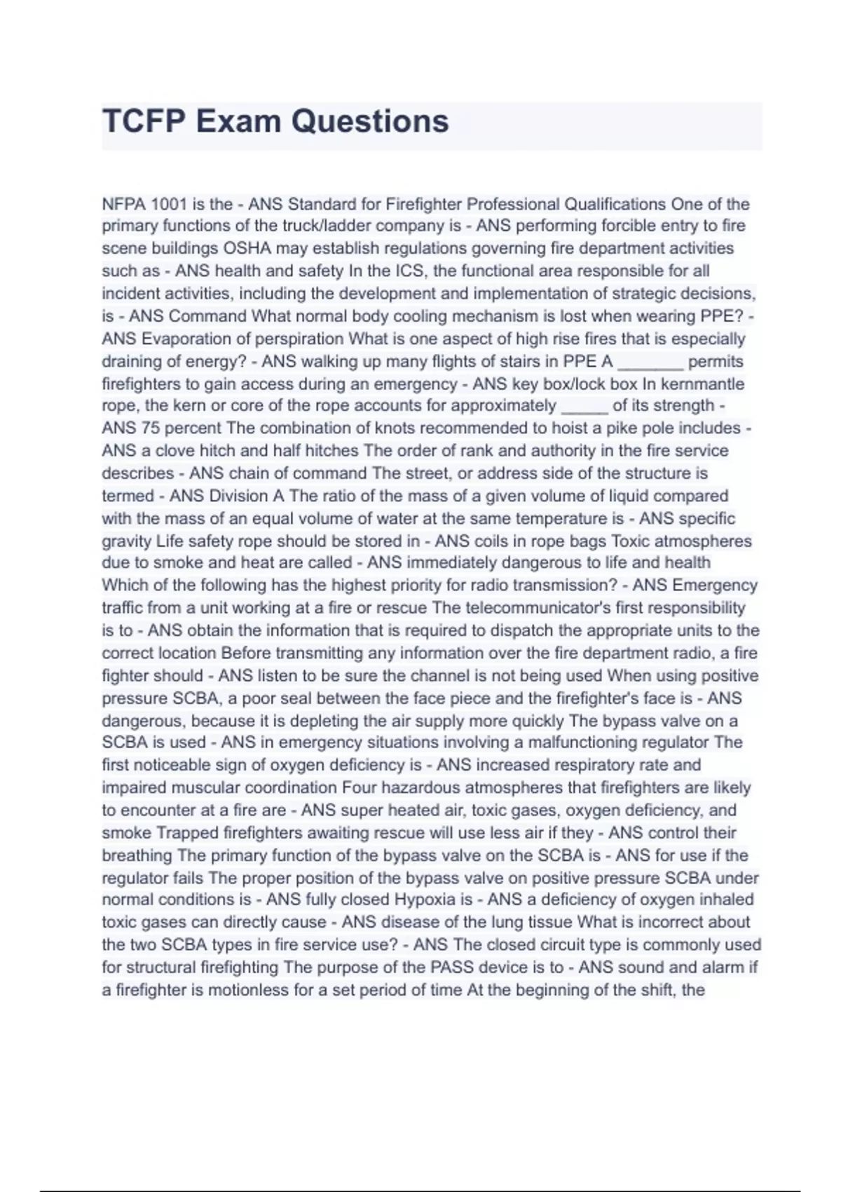 TCFP Exam Questions And Questions(AGRADED 100% VERIFIED) NFPA 1001 is the - ANS Standard for Firefighter Professional Qualifications One of the primary functions of the truck/ladder company is - ANS performing forcible entry to fire scene buildings OSHA may establish regulations governing fire department activities such as - ANS health and safety In the ICS, the functional area responsible for all incident activities, including the development and implementation of strategic decisions, is - ANS Command What normal body cooling mechanism is lost when wearing PPE? - ANS Evaporation of perspiration What is one aspect of high rise fires that is especially draining of energy? - ANS walking up many flights of stairs in PPE A _______ permits firefighters to gain access during an emergency - ANS key box/lock box In kernmantle rope, the kern or core of the rope accounts for approximately _____ of its strength - ANS 75 percent The combination of knots recommended to hoist a pike pole includes - ANS a clove hitch and half hitches The order of rank and authority in the fire service describes - ANS chain of command The street, or address side of the structure is termed - ANS Division A The ratio of the mass of a given volume of liquid compared with the mass of an equal volume of water at the same temperature is - ANS specific
