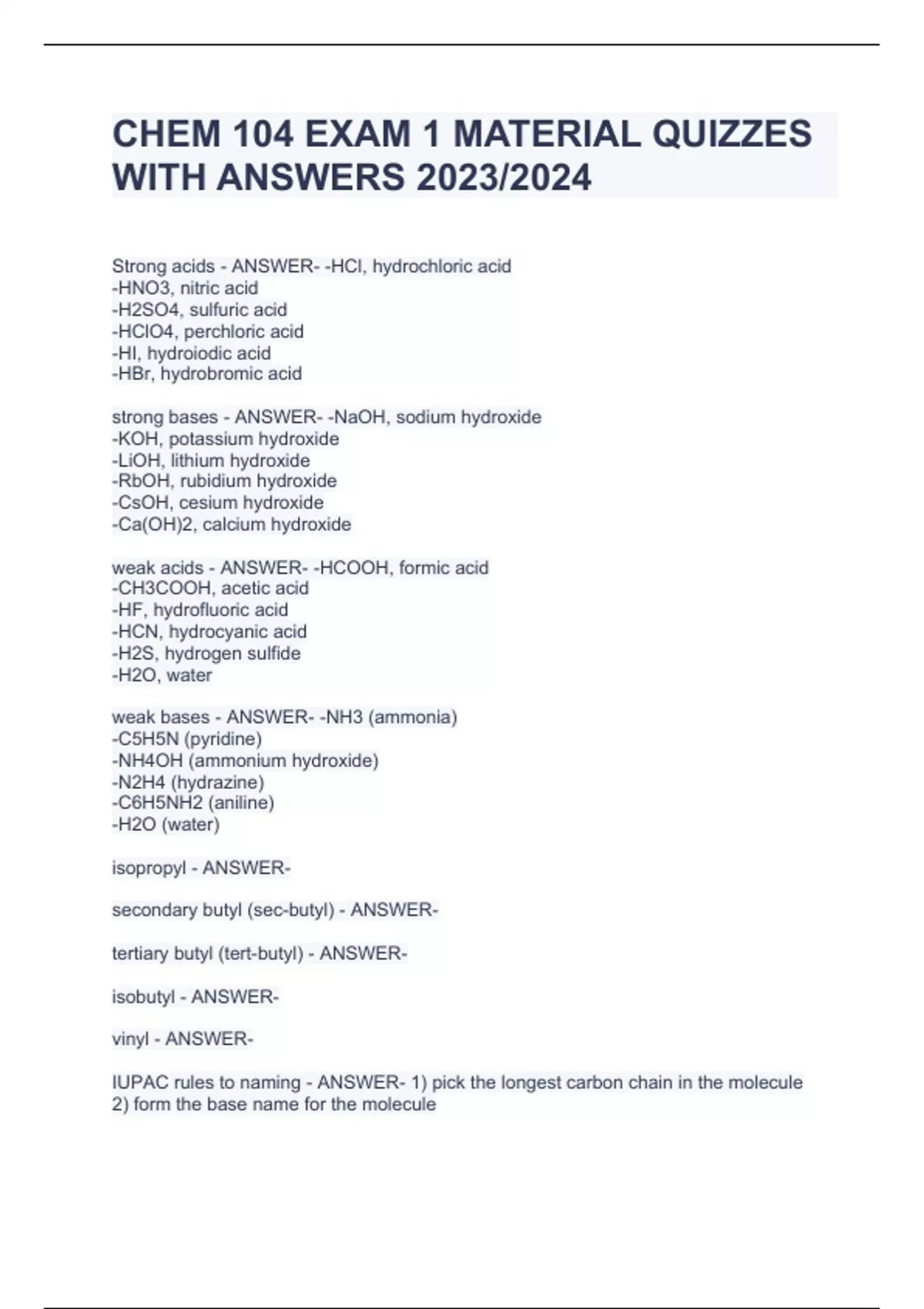 CHEM 104 EXAM 1 MATERIAL QUIZZES WITH ANSWERS 2023/2024