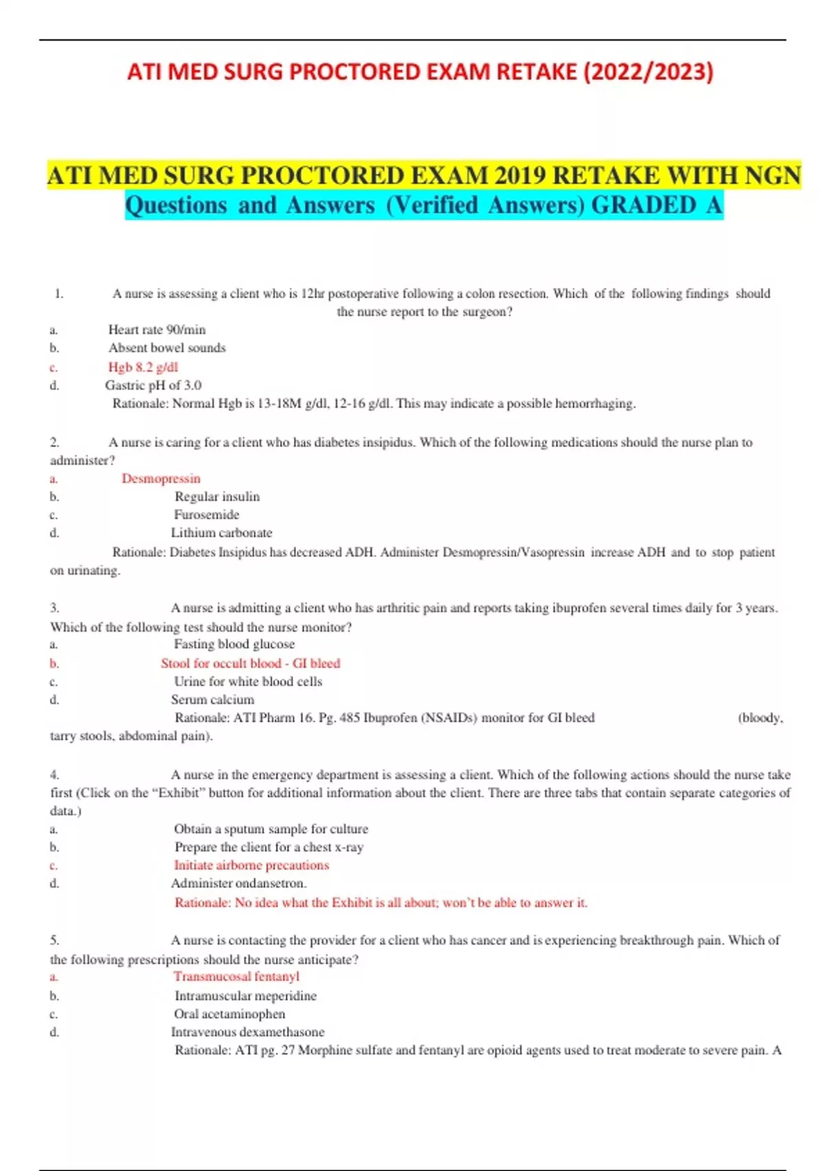 ATI MED SURG PROCTORED EXAM 2019 RETAKE WITH NGN Questions and Answers (Verified Answers)GRADED A ,,,+ ATI MED SURG PROCTORED EXAM 2019 RETAKE WITH NGN Questions and Answers (Verified Answers)GRADED A ,,,+