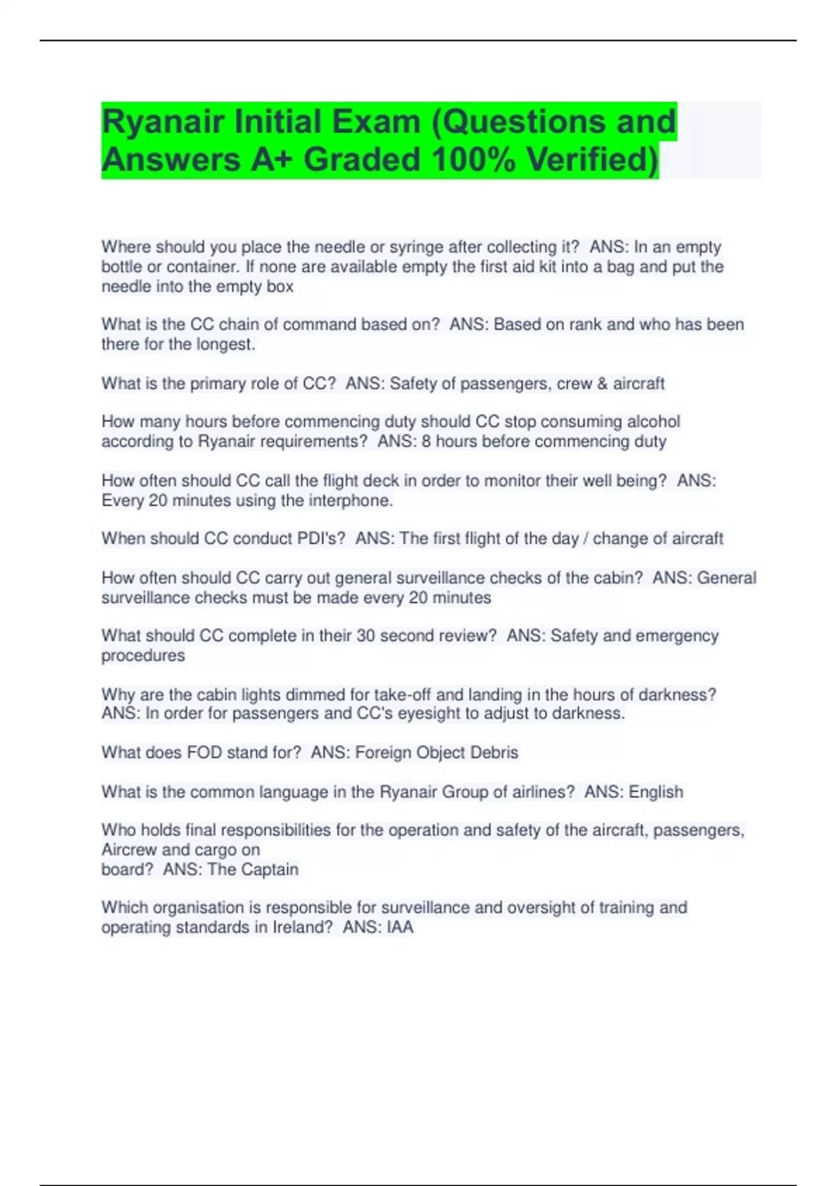 Ryanair Initial Exam (Questions and Answers A+ Graded 100% Verified) Where should you place the needle or syringe after collecting it? ANS: In an empty bottle or container. If none are available empty the first aid kit into a bag and put the needle into the empty box What is the CC chain of command based on? ANS: Based on rank and who has been there for the longest. What is the primary role of CC? ANS: Safety of passengers, crew & aircraft How many hours before commencing duty should CC stop consuming alcohol according to Ryanair requirements? ANS: 8 hours before commencing duty How often should CC call the flight deck in order to monitor their well being? ANS: Every 20 minutes using the interphone. When should CC conduct PDI's? ANS: The first flight of the day / change of aircraft How often should CC carry out general surveillance checks of the cabin? ANS: General surveillance checks must be made every 20 minutes What should CC complete in their 30 second review? ANS: Safety and emergency procedures Why are the cabin lights dimmed for take-off and landing in the hours of darkness? ANS: In order for passengers and CC's eyesight to adjust to darkness. What does FOD stand for? ANS: Foreign Object Debris What is the common language in the Ryanair Group of airlines? ANS: English Who holds final responsibilities for the operation and safety of the aircraft, passengers, Aircrew and cargo on board? ANS: The Captain Which organisation is responsible for surveillance and oversight of training and operating standards in Ireland? ANS: IAA CC shall seek advice from an Aero Medical Examiner after he/she has been suffering from any illness involving incapacity to function as CC for a period longer than? ANS: 21 days What could be a reason for go around/missed approach? ANS: Weather condition, technical problem, runway unsuitable for landing. Who could occupy vacant crew seat? ANS: Properly ticketed ryanair staff passenger or IAA inspector. How often should CC check the toilets? ANS: Every 20 minutes. What are SPIs? ANS: Safety procedure instructions What is the procedure for pregnant cabin crew? ANS: CC must stop flying as soon as the pregnancy is confirmed. The base supervisor and Crew control must be informed immediately. How many hours of duty can CC be rostered to operate? ANS: 13 hours What are your PDIs on assigned door? ANS: Open door - check exterior handle in place An open door way, without airbridge/stairs in place, has a safety strap attached. Closed door - handle is horizontal, door is flush with the fuselage and safety strap is stowed. What are your PDIs on jump seat area? ANS: Seat retracts correctly Seat belt/harness operational Mirrors, where fitted, provide an adequate view of the cabin from the seated position Covers for electrical sockets are present and intact. What are your PDIs on galley? ANS: Waste bins and waste cart operational. Trolleys and restraints operational. Bar seals intact, with no sign of tampering and seal numbers correspond correctly. Galley stowage locked/secured Galley power functions checked Curtains where fitted are secured open. Water shut off valve ON Boiler tap ON check for continuous flow Oven ON heat oven up for 5 min then turn off What are your PDIs in the cabin? ANS: ELS and PEM operational if present. Seat cushions in place. Ensure seat cushions at the overwing exits are fitted with a once inch diameter grey identification circle on the front edge of the seat cover. Seat belts are in place. Tables are stowable. Correct safety card in each seat pocket at row 1ABC and 2DEF All no smoking and fasten seat belt signs are serviceable. All life jackets for pax seats are present and correctly stowed. For life jackets in the PSU - check each viewing window is yellow/white, red tag not visible. Carpets secure and not frayed All cabin mouldings are secure What are your PDIs on toilet? ANS: Waste bin flap operational ensure water supply selector is set to supply, flush, water and vacuum systems cut out and water not overheating, all stowage/compartments closed and secure, internal lights function correctly, lock toilets after checks completed to prevent unauthorised carriage of pax, PDIs on the freon, PDIs on smoke detector What are the different fire prevention actions? ANS: Smoking is not permitted at any time on board. Ovens are only to be used for cooking food and not as a stowage compartment. Failing to comply with this can lead to the oven becoming inoperative and a serious fire risk. All aircraft electrical equipment should only be used for their intended purposes. Circuit breakers must only be pulled if you suspect an electrical problem or fire hazard with the piece of equipment. The smoke detector sensors in each toilet must be checked to ensure that they have not been disabled or tampered with. Access doors to waste bins are fully closed and securely latched. What are your actions during the command "CC return to your seats"? ANS: Immediately stop what you are doing, stow trolleys and return to assigned seat. After which period of time do cabin crew have to contact the flight crew to enable their well-being? ANS: Every 20 minutes using the interphone. What is Ryanair policy on carrying weapons & ammunition onboard our aircrafts? ANS: We do not carry any weapons or ammunition on board, it is prohibited What does PSU stand for? ANS: Passenger Service Unit What does PA stand for? ANS: Passenger Announcement/Public Address What is the definition of outboard? ANS: The direction towards the outside of the aircraft. What is the definition of load sheet? ANS: A mass and balance document which includes information such as pax and baggage numbers, weights and location. What is the definition of landing gear? ANS: The wheels and it's components on which an aircraft lands. May also be called undercarriage. What is the definition of inboard? ANS: The direction towards the center line of the aircraft. What is the definition of infant? ANS: A person under the age of 2 y