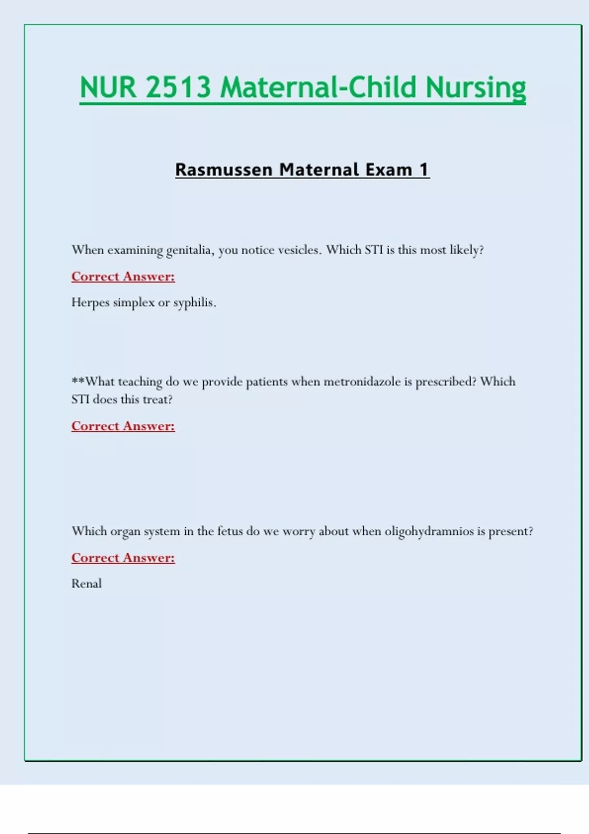 Exam 1: NUR2513 / NUR 2513 (Latest 2024 / 2025 UPDATES STUDY BUNDLE) Maternal-Child Nursing / MCN Exam Reviews | Questions and Verified Answers | 100% Correct | Grade A - Rasmussen