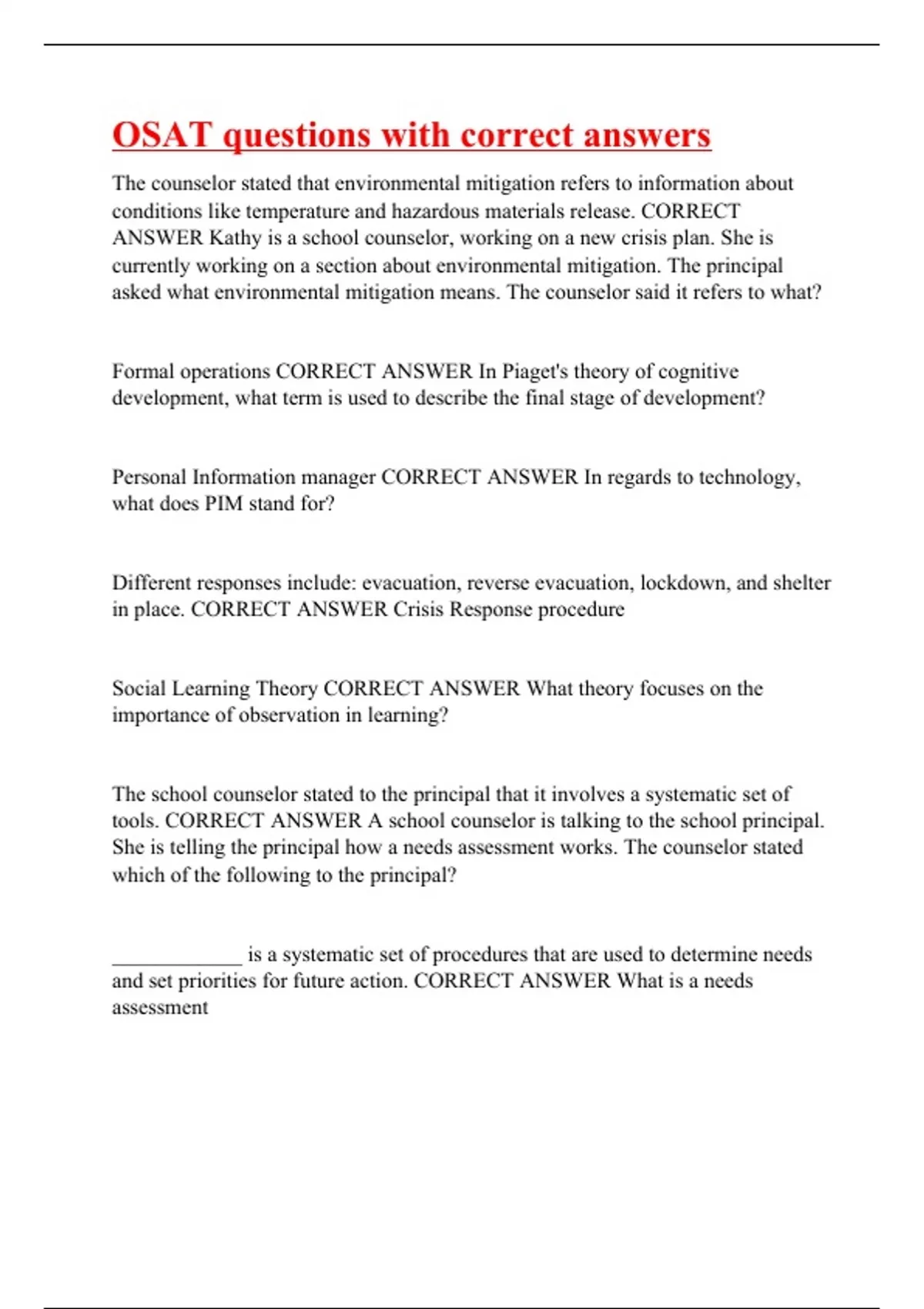 The counselor stated that environmental mitigation refers to information about conditions like temperature and hazardous materials release. CORRECT ANSWER Kathy is a school counselor, working on a new crisis plan. She is currently working on a section about environmental mitigation. The principal asked what environmental mitigation means. The counselor said it refers to what? Formal operations CORRECT ANSWER In Piaget's theory of cognitive development, what term is used to describe the final stage of development? Personal Information manager CORRECT ANSWER In regards to technology, what does PIM stand for? Different responses include: evacuation, reverse evacuation, lockdown, and shelter in place. CORRECT ANSWER Crisis Response procedure Social Learning Theory CORRECT ANSWER What theory focuses on the importance of observation in learning? The school counselor stated to the principal that it involves a systematic set of tools. CORRECT ANSWER A school counselor is talking to the school principal. She is telling the principal how a needs assessment works. The counselor stated which of the following to the principal? ____________ is a systematic set of procedures that are used to determine needs and set priorities for future action. CORRECT ANSWER What is a needs assessment