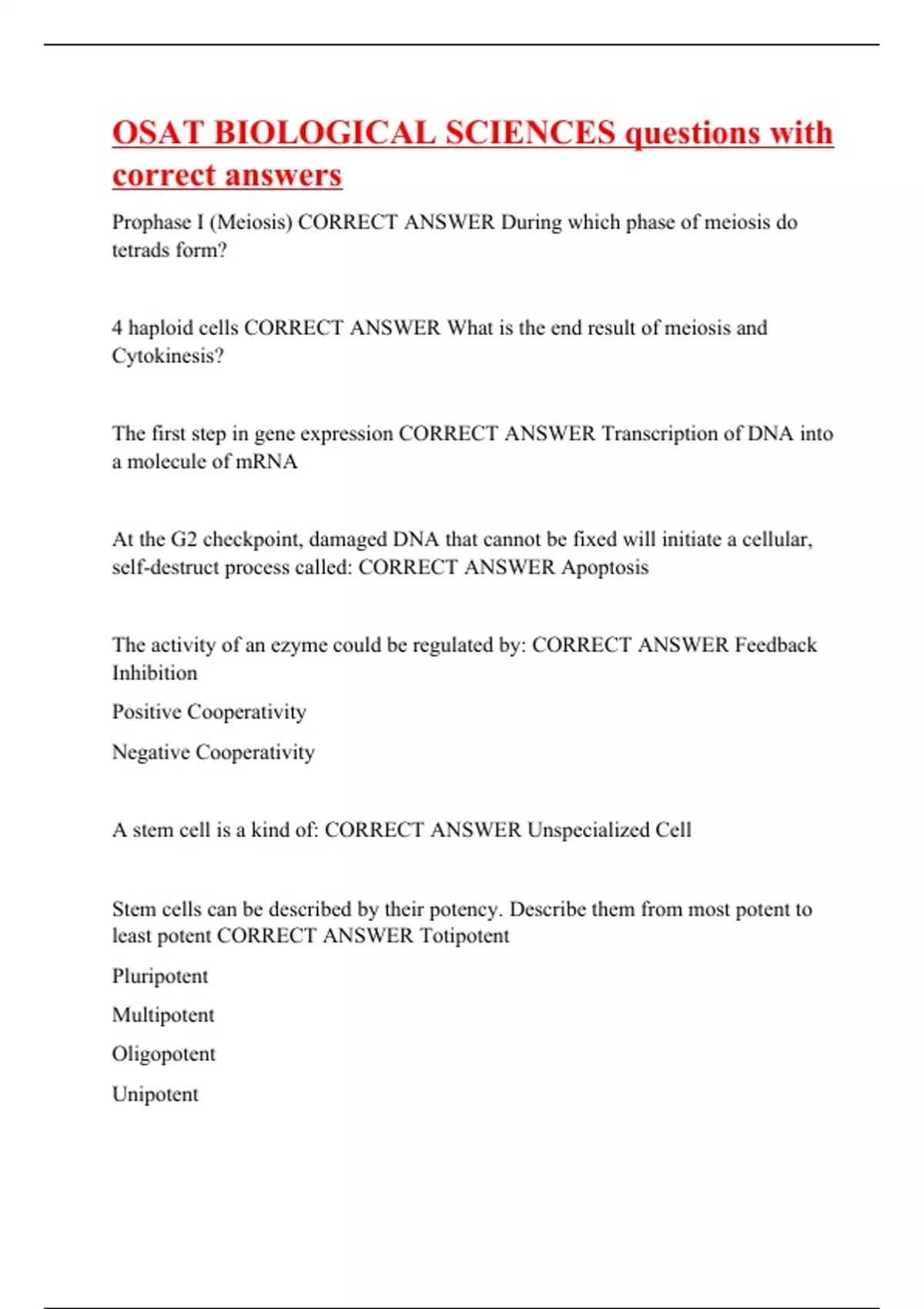 OSAT BIOLOGICAL SCIENCES questions with correct answers