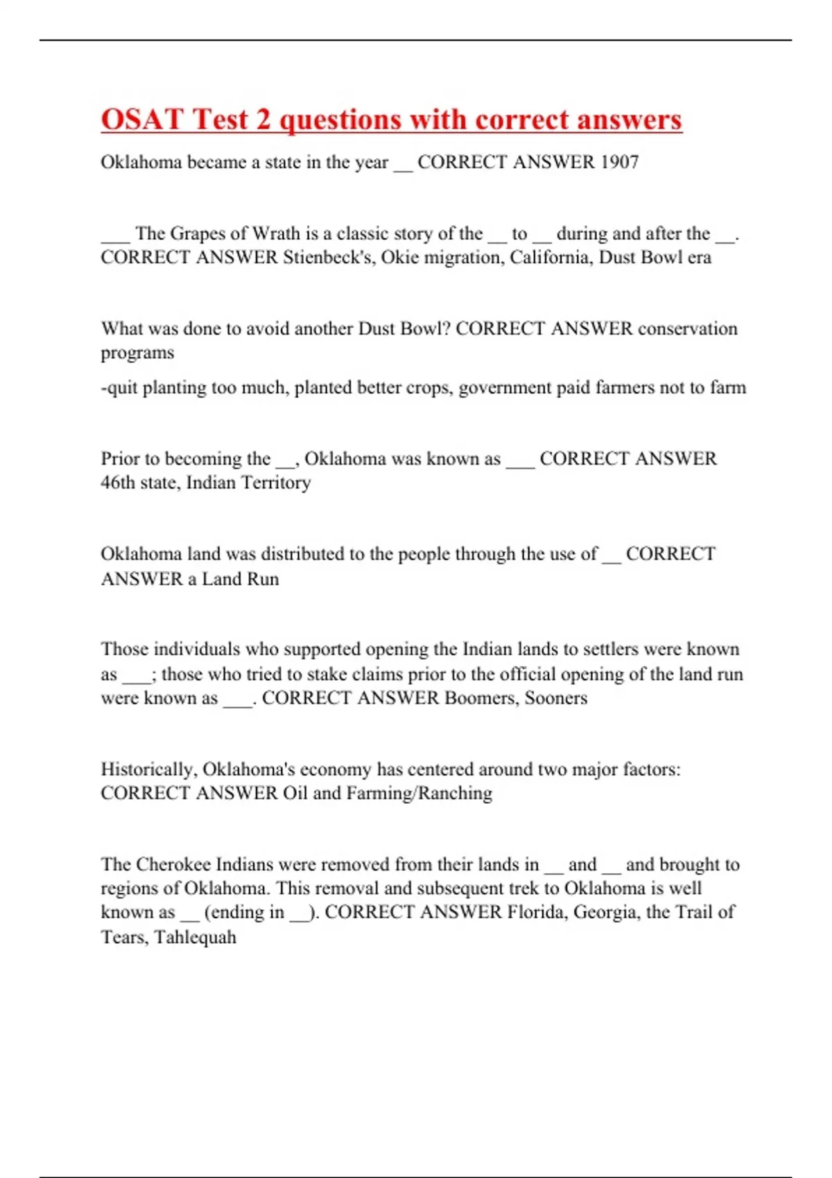 Oklahoma became a state in the year __ CORRECT ANSWER 1907 ___ The Grapes of Wrath is a classic story of the __ to __ during and after the __. CORRECT ANSWER Stienbeck's, Okie migration, California, Dust Bowl era What was done to avoid another Dust Bowl? CORRECT ANSWER conservation programs -quit planting too much, planted better crops, government paid farmers not to farm Prior to becoming the __, Oklahoma was known as ___ CORRECT ANSWER 46th state, Indian Territory Oklahoma land was distributed to the people through the use of __ CORRECT ANSWER a Land Run Those individuals who supported opening the Indian lands to settlers were known as ___; those who tried to stake claims prior to the official opening of the land run were known as ___. CORRECT ANSWER Boomers, Sooners Historically, Oklahoma's economy has centered around two major factors: CORRECT ANSWER Oil and Farming/Ranching The Cherokee Indians were removed from their lands in __ and __ and brought to regions of Oklahoma. This removal and subsequent trek to Oklahoma is well known as __ (ending in __). CORRECT ANSWER Florida, Georgia, the Trail of Tears, Tahlequah