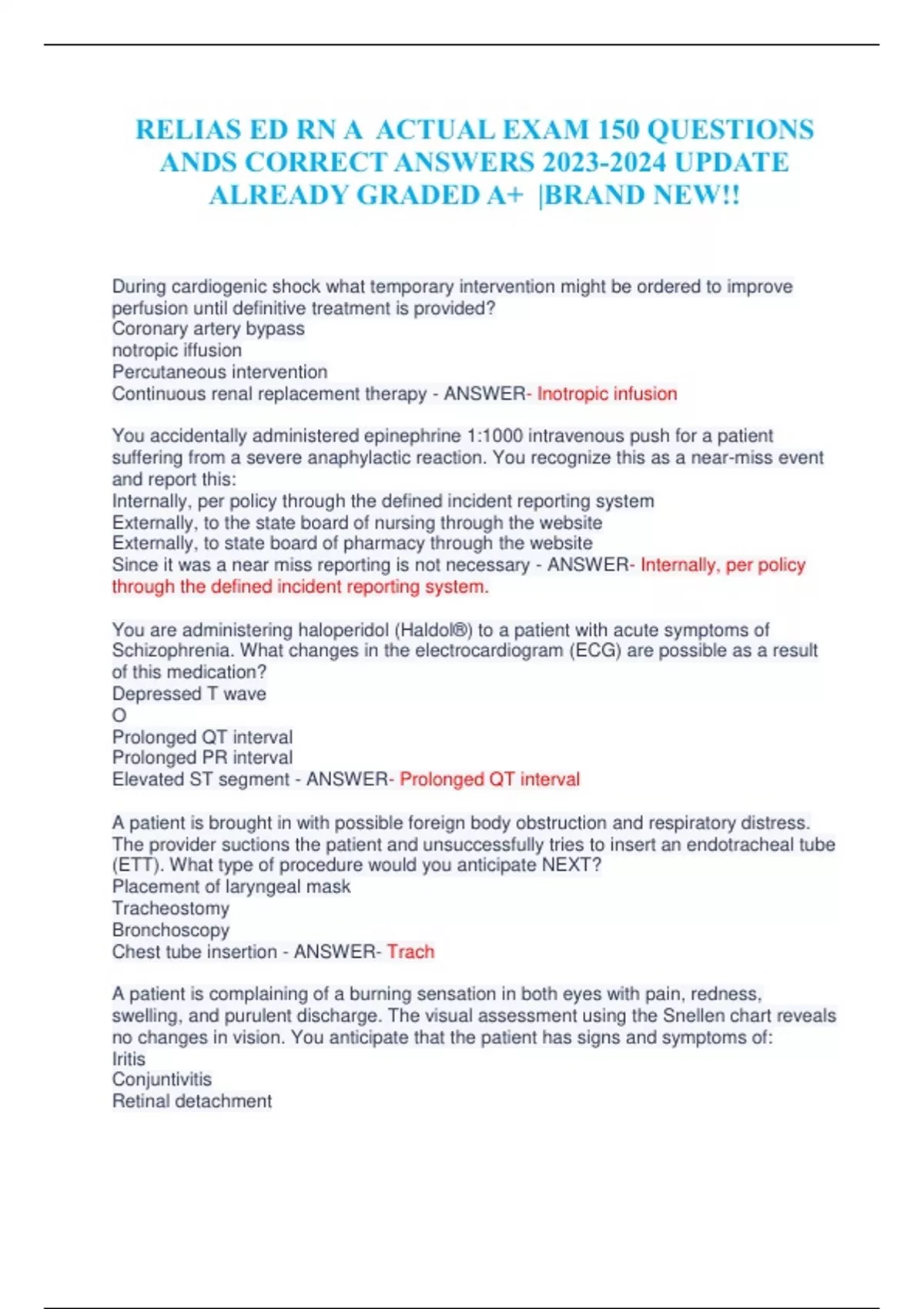 RELIAS MEDICAL SURGICAL RN A EXAM QUESTIONS AND ANSWERS 2023- 2024 UPDATE A GRADED You were hired to work the medical unit and when you arrive at work the charge nurse has assigned you to the post surgical unit since they are under staffed. Which is the most appropriate action? - ANSWER- Report to the post surgical unit What type of personal protective equipment(Ppe) Is applied prior to entering a room for a patient with with C diff? - ANSWER- Gown and gloves When would sucralfate(Carafate) 4 times daily be scheduled for? - ANSWER- 1 hour before meals and at bedtime Your new patient was admitted with Blunt force trauma to the abdomen Following a motor vehicle accident. A NG Tube is in place for decompression, however, you note during the assessment that the stomach is rigid and hard during palpation. What condition do you suspect. - ANSWER- Hemorrhage What is clubbing of the fingers most likely associated with? - ANSWER- Chronic oxygen deficiency Is your patient with hepatitis C Exhibits signs of jaundice and a distended abdomen. What procedure would you anticipate being performed by the provider at the bedside for this patient? - ANSWER- Paracentesis Is the provider gives you a telephone order to explain a surgical procedure to your patient and obtain surgical consent. How should you respond? - ANSWER- Inform the provider that explaining the procedure is outside the nurse's scope of practice. You're patient Recently had a G Tube Placed and interminent enteral Feedings have been initiated. What symptoms may indicate intolerance to the feedings? - ANSWERVomiting and diarrhea You are caring for a patient post lobotomy With a chest tube in place for drainage. What is a priority in caring for this patient? - ANSWER- Encourage the patient to cough and deep breathe. Your new patient understands very limited English. How should you communicate with them when completing the admission assessment? - ANSWER- Use the organizations interpreter services You are ordered to give Digoxin(lanoxin). Your patience vital signs are BP 130/75, temp 97.9F, HR 52, RR 16, o2 sat 100% on room air. What should you do next? - ANSWERHOLD DIGOXIN AND CALL PROVIDER Your patient tells you I hope I don't die, but if I do I don't want to be brought back. You notice on her chart and wrist band that she is a full code. What would be the most appropriate action? - ANSWER- Discuss code status with the patient and follow up with the provider to ensure the medical record reflects her wishes