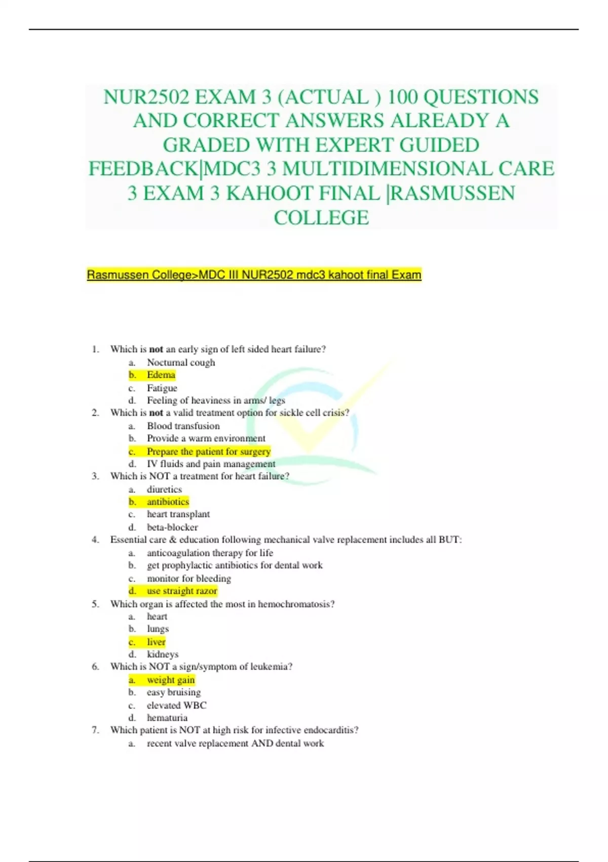 MENTAL HEALTH | ATI MENTAL HEALTH FORM A , B, C ACTUAL EXAMS QUESTIONS AND CORRECT ANSWERS UPDATE ALREADY A GRADED|BRAND NEW!! 1. A nurse is teaching a client with schizophrenia about her new prescription for risperidone. Which of the following statements should the nurse include in the teaching? a. You should discontinue the medication if you develop muscle rigidity b. You will experience weight loss while taking this medication c. You will notice your symptoms improve than 24 hours of taking this medication d. You should increase your consumption of complex carbohydrates 2. A nurse is admitting a client who has generalized anxiety disorder. Which of the following actionsshould the nurse plan to take first? a. Provide the client with a quiet environment b. Determine how the client handle stress c. Teach the client to use guided imagery d. Ask the client to identify her strengths 3. A nurse is conducting an admission interview with a client who is experiencing mania. Which of the following findings should the nurse report to the provider? a. States that he hasn't bathed in 2 days b. Reports eating twice in the past week c. Make inappropriate sexual comments d. Speak in rhyming sentences 4. A nurse is planning care for a client who has OCD. Which of the following recommendation should the nurse include in the client’s plan of care? a. Validation therapy b. Thoughtstopping c. Operant conditioning d. Reality orientation therapy 5. A nurse is caring for a client who has bipolar disorder and experiencing a manic episode. Which of the following actions should the nurse take? a. Encouraged client to join group activities b. Dim the lights in the client’s room c. Provide detailed explanations to the client d. Administer methylphenidate to the client 6. A nurse is leading a crisis intervention group for adolescents who witnessed the suicide of a classmate. Which of the following actions should the nurse take first? a. Initiate referrals b. Review Community Resources c. Identify prior coping skills d. Discussthe importance of confidentiality 7. A nurse overhears a client saying, “I am a spy, a spy for the FBI. I am an I, an eye for an eye, and eye in the sky. Sky is up high.” The nurse should document the client statement as which of the following speech alterations? a. Echolalia b. Word salad c. Neologism d. Clang Associatio