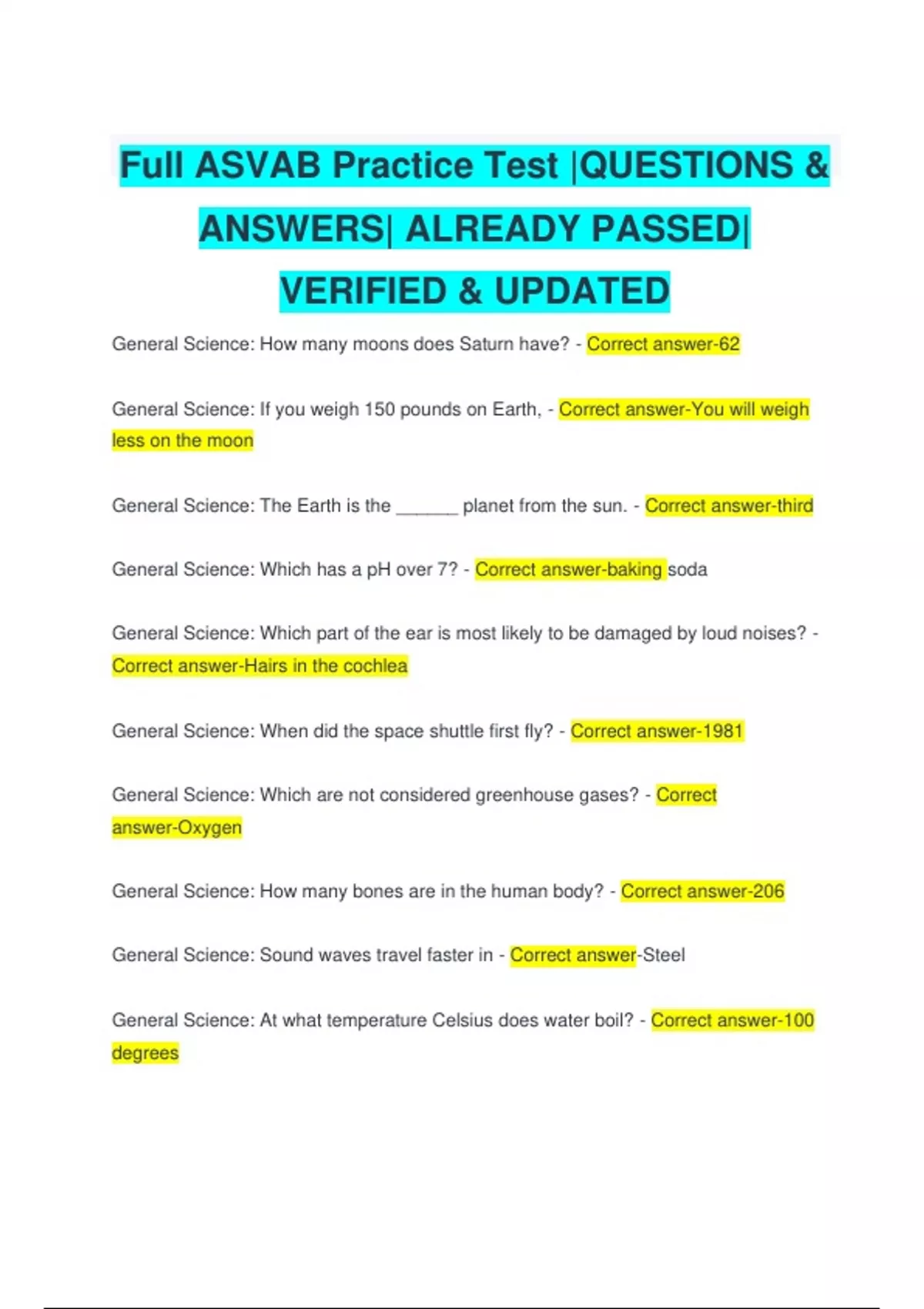 Full ASVAB Practice Test |QUESTIONS & ANSWERS| ALREADY PASSED| VERIFIED & UPDATED General Science: How many moons does Saturn have? - Correct answer-62 General Science: If you weigh 150 pounds on Earth, - Correct answer-You will weigh less on the moon General Science: The Earth is the ______ planet from the sun. - Correct answer-third General Science: Which has a pH over 7? - Correct answer-baking soda General Science: Which part of the ear is most likely to be damaged by loud noises? - Correct answer-Hairs in the cochlea General Science: When did the space shuttle first fly? - Correct answer-1981 General Science: Which are not considered greenhouse gases? - Correct answer-Oxygen General Science: How many bones are in the human body? - Correct answer-206 General Science: Sound waves travel faster in - Correct answer-Steel General Science: At what temperature Celsius does water boil? - Correct answer-100 degrees
