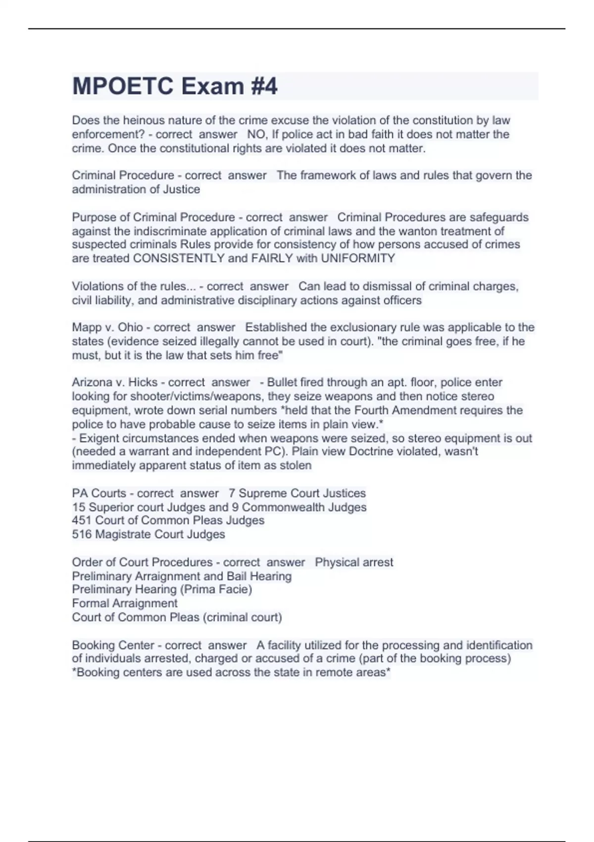 MPOETC Exa3 Question and ans Does the heinous nature of the crime excuse the violation of the constitution by law enforcement? - correct answer NO, If police act in bad faith it does not matter the crime. Once the constitutional rights are violated it does not matter. Criminal Procedure - correct answer The framework of laws and rules that govern the administration of Justice Purpose of Criminal Procedure - correct answer Criminal Procedures are safeguards against the indiscriminate application of criminal laws and the wanton treatment of suspected criminals Rules provide for consistency of how persons accused of crimes are treated CONSISTENTLY and FAIRLY with UNIFORMITY wers already passed 2023/2024