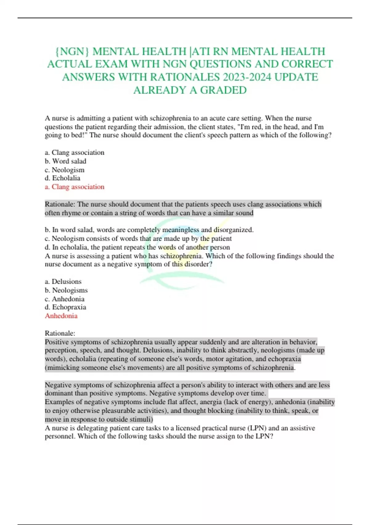 {NGN} MENTAL HEALTH |ATI RN MENTAL HEALTH ACTUAL EXAM WITH NGN QUESTIONS AND CORRECT ANSWERS WITH RATIONALES UPDATE ALREADY A GRADED A nurse is admitting a patient with schizophrenia to an acute care setting. When the nurse questions the patient regarding their admission, the client states, "I'm red, in the head, and I'm going to bed!" The nurse should document the client's speech pattern as which of the following? a. Clang association b. Word salad c. Neologism d. Echolalia a. Clang association Rationale: The nurse should document that the patients speech uses clang associations which often rhyme or contain a string of words that can have a similar sound b. In word salad, words are completely meaningless and disorganized. c. Neologism consists of words that are made up by the patient d. In echolalia, the patient repeats the words of another person A nurse is assessing a patient who has schizophrenia. Which of the following findings should the nurse document as a negative symptom of this disorder? a. Delusions b. Neologisms c. Anhedonia d. Echopraxia Anhedonia Rationale: Positive symptoms of schizophrenia usually appear suddenly and are alteration in behavior, perception, speech, and thought. Delusions, inability to think abstractly, neologisms (made up words), echolalia (repeating of someone else's words, motor agitation, and echopraxia (mimicking someone else's movements) are all positive symptoms of schizophrenia. Negative symptoms of schizophrenia affect a person's ability to interact with others and are less dominant than positive symptoms. Negative symptoms develop over time. Examples of negative symptoms include flat affect, anergia (lack of energy), anhedonia (inability to enjoy otherwise pleasurable activities), and thought blocking (inability to think, speak, or move in response to outside stimuli) A nurse is delegating patient care tasks to a licensed practical nurse (LPN) and an assistive personnel. Which of the following tasks should the nurse assign to the LPN? Change the dressing of a client who has borderline personality disorder and superficial selfinflicted wounds Rationale: A patient who has borderline personality disorder is at risk for self-mutilation such as cutting, self-inflicted wounds, scratching or picking at wounds. It is within the LPNs scope of practice to change the dressing, cleanse the wound, and collect data regarding the healing of the wound. A nurse is assessing a school-age child who has conduct disorder. Which of the following characteristics should the nurse expect the child to demonstrate? a. Feelings of remorse b. Extended periods of depression c. Deficits in intellectual functioning d. Aggression towards animals d. Aggression toward animals Rationale: The nurse should identify that aggression toward people and animals is an expected characteristic of a child who has conduct disorder a. The nurse should identify that lack of remorse is an expected characteristic of a child who has conduct disorder b. The nurse should identify that a child who has bipolar disorder is likely to have extended periods of depression. This is not an expected characteristic of a child who has conduct disorder c. The nurse should identify that a child who has intellectual deficit disorder exhibits deficits in intellectual functioning, such as reasoning, abstract thinking, and academic ability. A deficit in intellectual functioning is not an expected characteristic of a child who has conduct disorder A nurse in a mental health clinic is planning care for a client who has a new prescription for Olanzapine. Which of the following interventions should the nurse identify as the priority? Instruct the client to avoid driving during initial therap