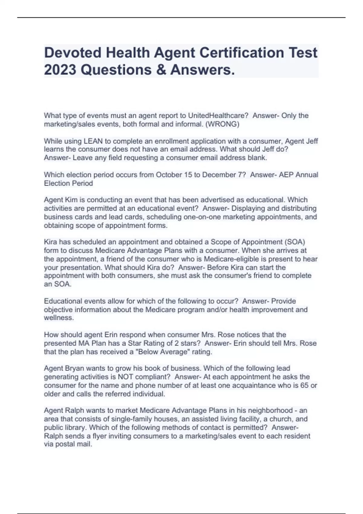 Devoted Health Agent Certification Test 2023 Questions & Answers.