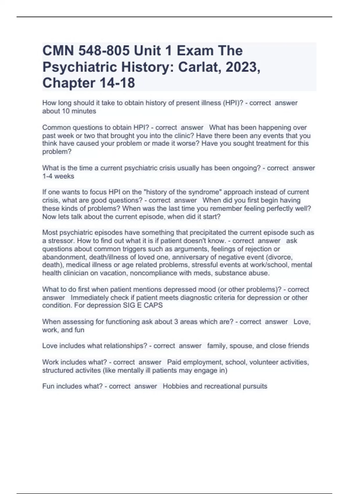 CMN 548 Question aHow long should it take to obtain history of present illness (HPI)? - correct answer about 10 minutes Common questions to obtain HPI? - correct answer What has been happening over past week or two that brought you into the clinic? Have there been any events that you think have caused your problem or made it worse? Have you sought treatment for this problem? What is the time a current psychiatric crisis usually has been ongoing? - correct answer 1-4 weeks If one wants to focus HPI on the "history of the syndrome" approach instead of current crisis, wha nd answers already passed 2023/2024