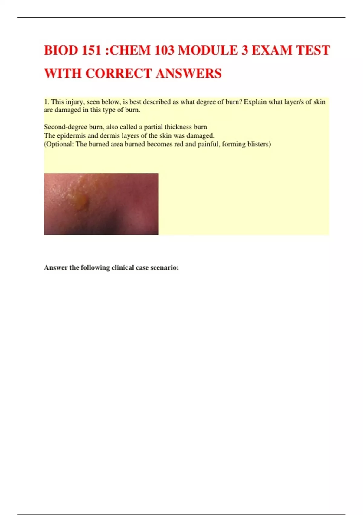 BIOD 151 :CHEM 103 MODULE 3 EXAM TEST WITH CORRECT ANSWERS Answer the following clinical case scenario: 1. Your patient was injured in a house fire. The skin sustained damage through the epidermis, dermis, hypodermis, and some muscle tissue. 1- What degree of burn best describes your patient’s injury? 2- Would your patient experience pain in the injured area? Why or why not? -4th degree -No, fourth-degree burns damage the epidermis, the dermis, the hypodermis, and underlying tissue such as muscle or bone. Because the nerve endings are destroyed there is no sensation in the affected burn area. 1) This patient has fourth degree burn. 2)Sense the nerve endings are destroyed in the affected area, the patient will not feel pain in that area. Answer the following four questions: 1. This part of a hair contains blood and nervous supply: A. Bulb B. Root C. Shaft D. Keratin A. Bulb 2. Hair is made up of: A. Living epidermal cells converted to collagen B. Dead epidermal cells converted to collagen C. Living epidermal cells converted to keratin D. Dead epidermal cells converted to keratin D. Dead epidermal cells converted to keratin 3. Nails are hard, dead cells which have been converted to A. Keratin B. Collagen C. Calcium D. Corneum A. Keratin