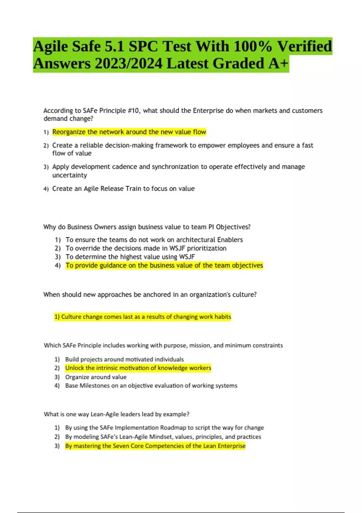 Agile Safe 5.1 SPC Test With 100% Verified Answers 2023/2024 Latest Graded A+