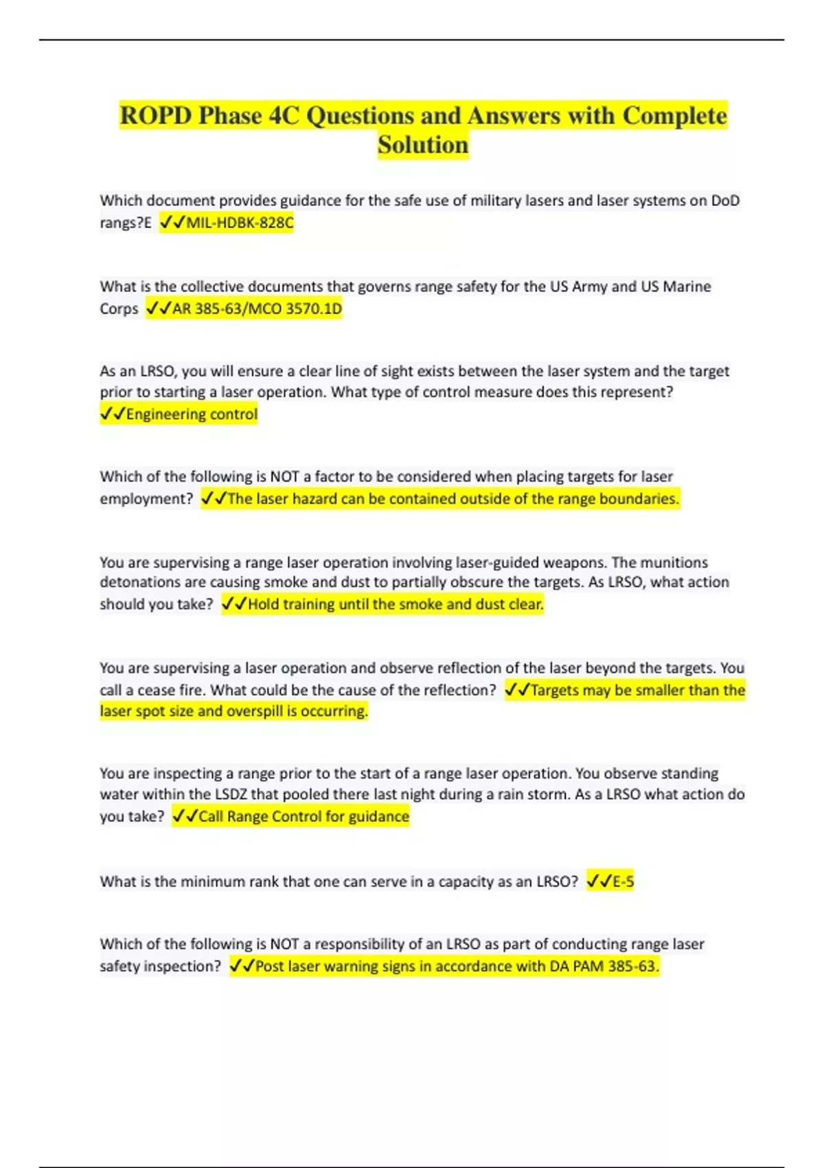 ROPD Phase 4C Questions and Answers with Complete Solution Which document provides guidance for the safe use of military lasers and laser systems on DoD rangs?E MIL-HDBK-828C What is the collective documents that governs range safety for the US Army and US Marine Corps AR 385-63/MCO 3570.1D As an LRSO, you will ensure a clear line of sight exists between the laser system and the target prior to starting a laser operation. What type of control measure does this represent? Engineering control Which of the following is NOT a factor to be considered when placing targets for laser employment? The laser hazard can be contained outside of the range boundaries. You are supervising a range laser operation involving laser-guided weapons. The munitions detonations are causing smoke and dust to partially obscure the targets. As LRSO, what action should you take? Hold training until the smoke and dust clear.