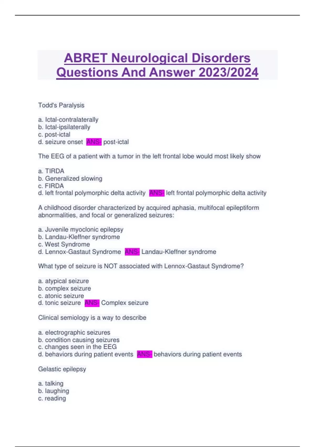 ABRET Neurological Disorders Questions And Answer 2023/2024
