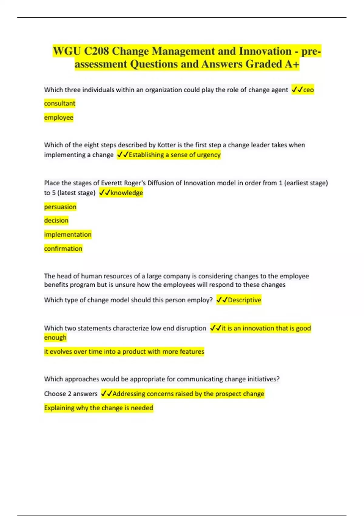 WGU C208 Change Management and Innovation - pre- assessment Questions and Answers Graded A+