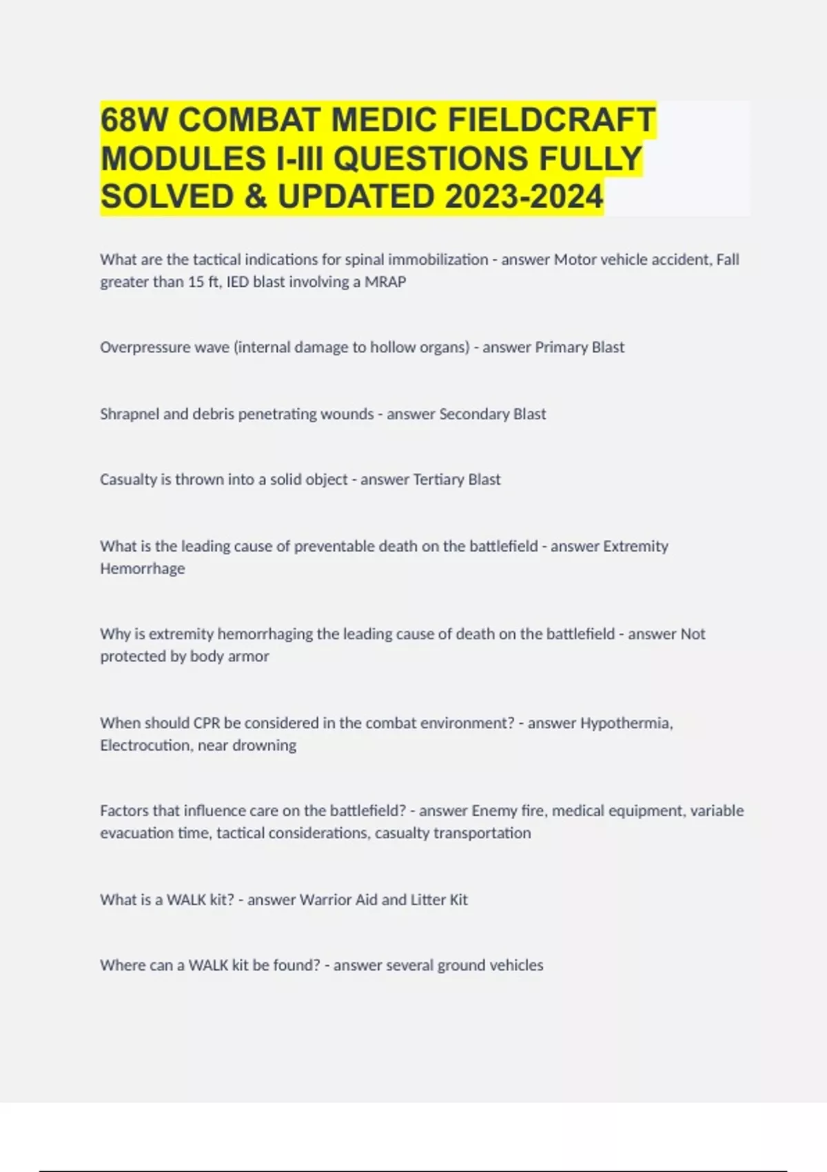 68W COMBAT MEDIC FIELDCRAFT MODULES I-III QUESTIONS FULLY SOLVED & UPDATED