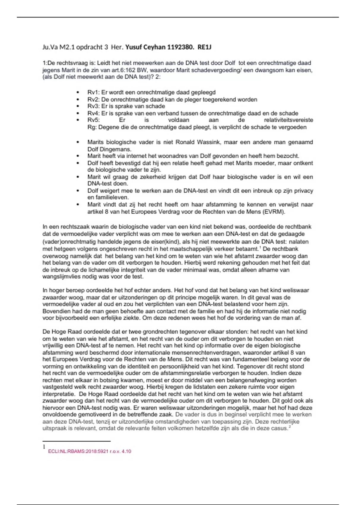 1:De rechtsvraag is: Leidt het niet meewerken aan de DNA test door Dolf tot een onrechtmatige daad