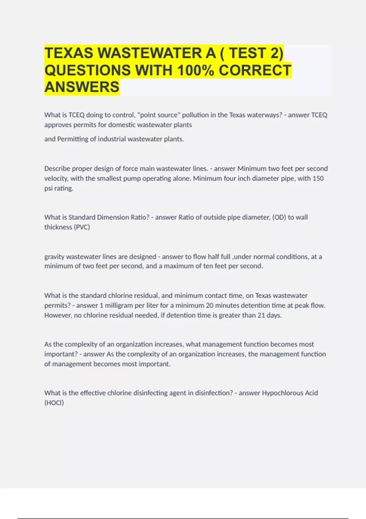 TEXAS WASTEWATER A ( TEST 2) QUESTIONS WITH 100% CORRECT ANSWERS