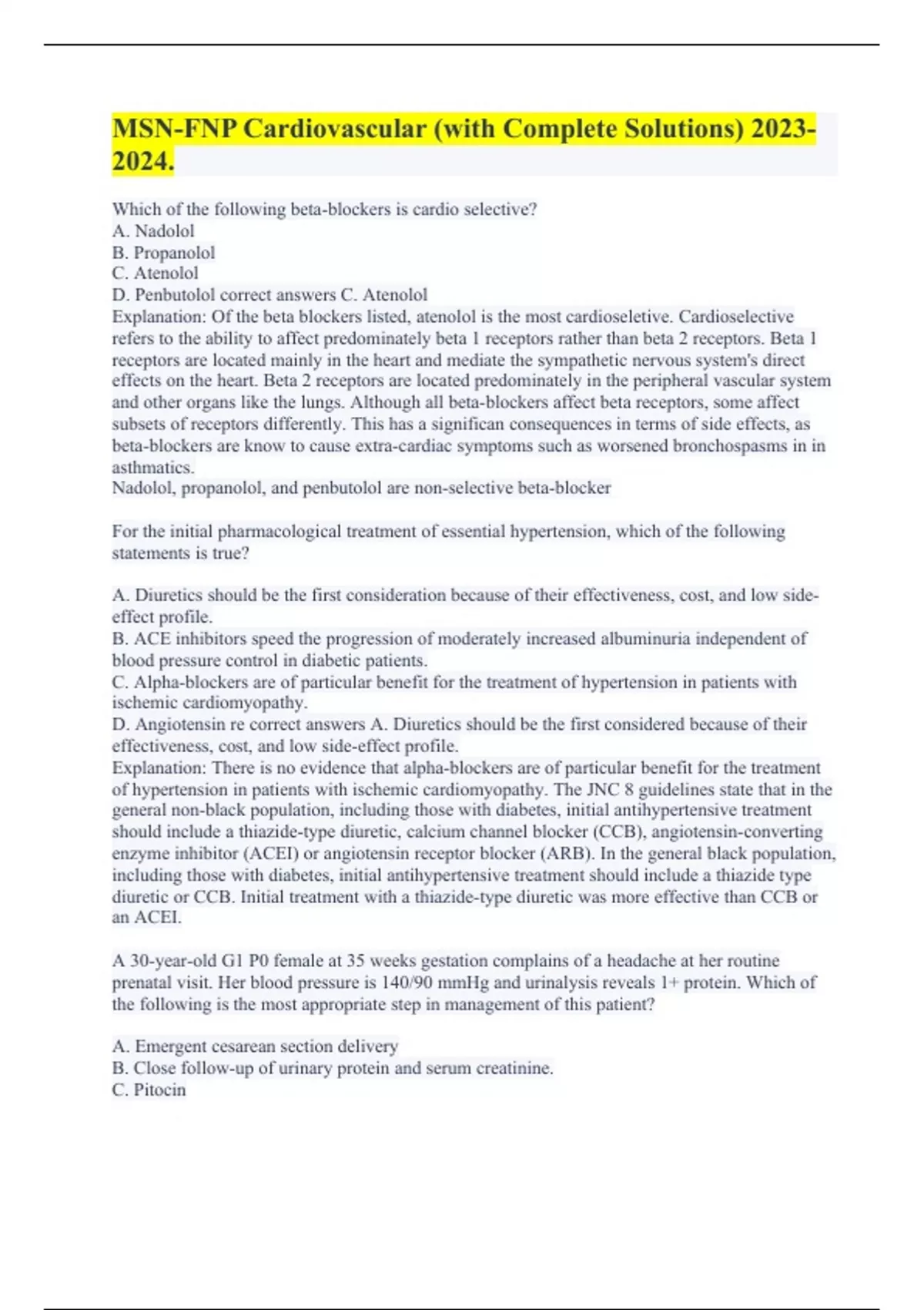 Which of the following beta-blockers is cardio selective? A. Nadolol B. Propanolol C. Atenolol D. Penbutolol correct answers C. Atenolol Explanation: Of the beta blockers listed, atenolol is the most cardioseletive. Cardioselective refers to the ability to affect predominately beta 1 receptors rather than beta 2 receptors. Beta 1 receptors are located mainly in the heart and mediate the sympathetic nervous system's direct effects on the heart. Beta 2 receptors are located predominately in the peripheral vascular system and other organs like the lungs. Although all beta-blockers affect beta receptors, some affect subsets of receptors differently. This has a significan consequences in terms of side effects, as beta-blockers are know to cause extra-cardiac symptoms such as worsened bronchospasms in in asthmatics. Nadolol, propanolol, and penbutolol are non-selective beta-blocker For the initial pharmacological treatment of essential hypertension, which of the following statements is true? A. Diuretics should be the first consideration because of their effectiveness, cost, and low side-effect profile. B. ACE inhibitors speed the progression of moderately increased albuminuria independent of blood pressure control in diabetic patients. C. Alpha-blockers are of particular benefit for the treatment of hypertension in patients with ischemic cardiomyopathy. D. Angiotensin re correct answers A. Diuretics should be the first considered because of their effectiveness, cost, and low side-effect profile. Explanation: There is no evidence that alpha-blockers are of particular benefit for the treatment of hypertension in patients with ischemic cardiomyopathy. The JNC 8 guidelines state that in the general non-black population, including those with diabetes, initial antihypertensive treatment should include a thiazide-type diuretic, calcium channel blocker (CCB), angiotensin-converting enzyme inhibitor (ACEI) or angiotensin receptor blocker (ARB). In the general black population, including those with diabetes, initial antihypertensive treatment should include a thiazide type diuretic or CCB. Initial treatment with a thiazide-type diuretic was more effective than CCB or an ACEI. A 30-year-old G1 P0 female at 35 weeks gestation complains of a headache at her routine prenatal visit. Her blood pressure is 140/90 mmHg and urinalysis reveals 1+ protein. Which of the following is the most appropriate step in management of this patient? A. Emergent cesarean section delivery B. Close follow-up of urinary protein and serum creatinine. C. Pitocin