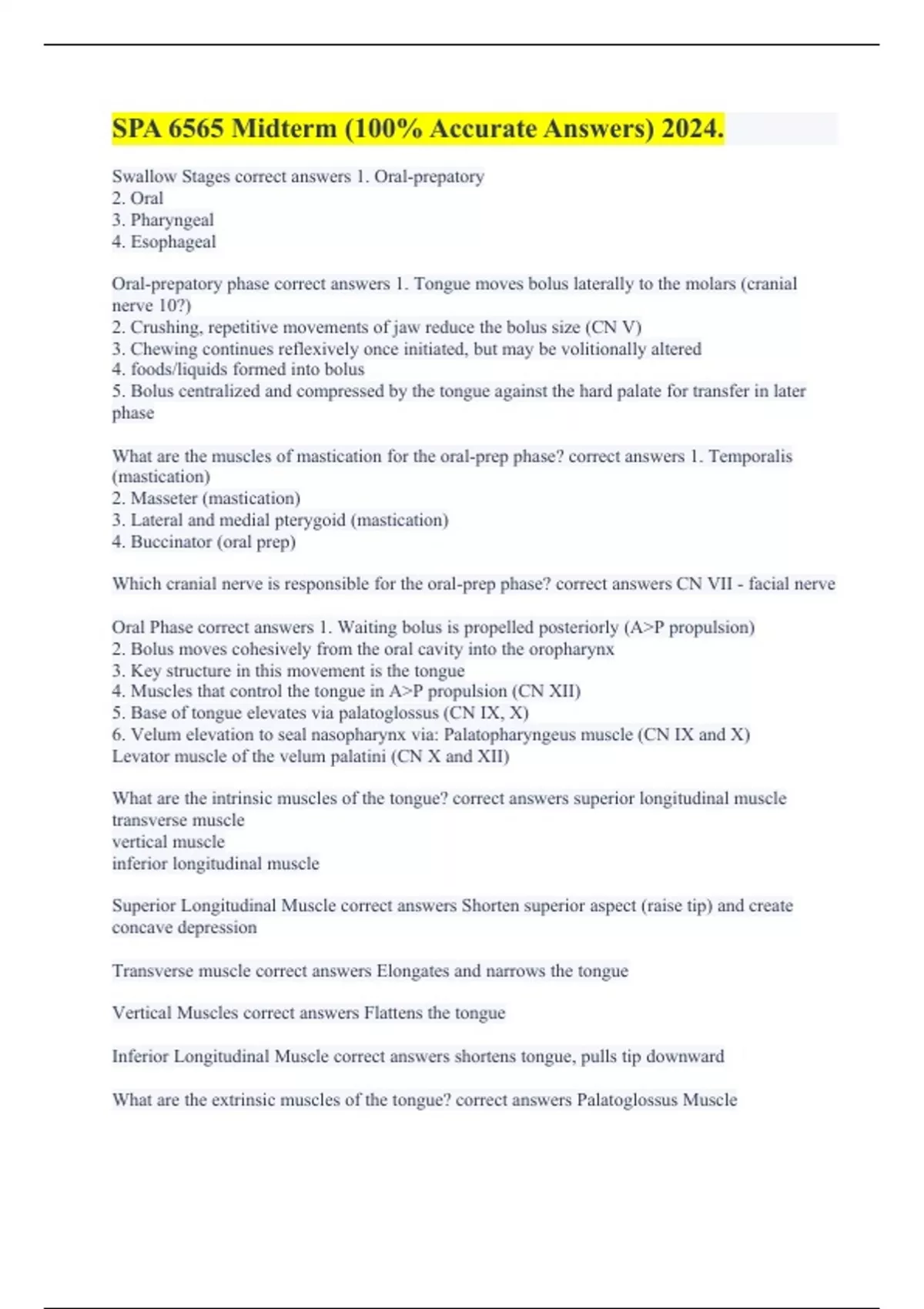 Swallow Stages correct answers 1. Oral-prepatory 2. Oral 3. Pharyngeal 4. Esophageal Oral-prepatory phase correct answers 1. Tongue moves bolus laterally to the molars (cranial nerve 10?) 2. Crushing, repetitive movements of jaw reduce the bolus size (CN V) 3. Chewing continues reflexively once initiated, but may be volitionally altered 4. foods/liquids formed into bolus 5. Bolus centralized and compressed by the tongue against the hard palate for transfer in later phase What are the muscles of mastication for the oral-prep phase? correct answers 1. Temporalis (mastication) 2. Masseter (mastication) 3. Lateral and medial pterygoid (mastication) 4. Buccinator (oral prep) Which cranial nerve is responsible for the oral-prep phase? correct answers CN VII - facial nerve Oral Phase correct answers 1. Waiting bolus is propelled posteriorly (A>P propulsion) 2. Bolus moves cohesively from the oral cavity into the oropharynx 3. Key structure in this movement is the tongue 4. Muscles that control the tongue in A>P propulsion (CN XII) 5. Base of tongue elevates via palatoglossus (CN IX, X) 6. Velum elevation to seal nasopharynx via: Palatopharyngeus muscle (CN IX and X) Levator muscle of the velum palatini (CN X and XII) What are the intrinsic muscles of the tongue? correct answers superior longitudinal muscle transverse muscle vertical muscle inferior longitudinal muscle Superior Longitudinal Muscle correct answers Shorten superior aspect (raise tip) and create concave depression Transverse muscle correct answers Elongates and narrows the tongue Vertical Muscles correct answers Flattens the tongue Inferior Longitudinal Muscle correct answers shortens tongue, pulls tip downward What are the extrinsic muscles of the tongue? correct answers Palatoglossus Muscle