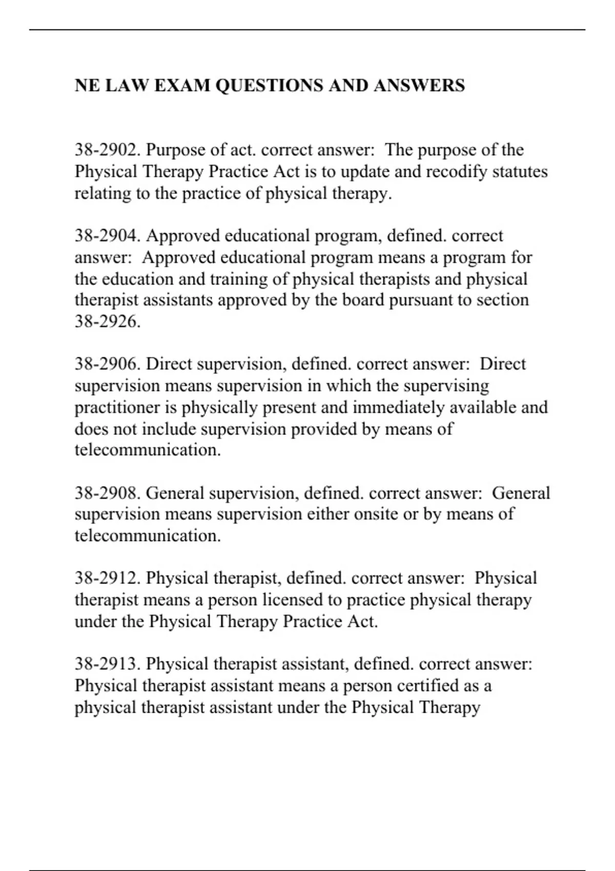 38-2902. Purpose of act. correct answer: The purpose of the Physical Therapy Practice Act is to update and recodify statutes relating to the practice of physical therapy. 38-2904. Approved educational program, defined. correct answer: Approved educational program means a program for the education and training of physical therapists and physical therapist assistants approved by the board pursuant to section 38-2926. 38-2906. Direct supervision, defined. correct answer: Direct supervision means supervision in which the supervising practitioner is physically present and immediately available and does not include supervision provided by means of telecommunication. 38-2908. General supervision, defined. correct answer: General supervision means supervision either onsite or by means of telecommunication. 38-2912. Physical therapist, defined. correct answer: Physical therapist means a person licensed to practice physical therapy under the Physical Therapy Practice Act. 38-2913. Physical therapist assistant, defined. correct answer: Physical therapist assistant means a person certified as a physical therapist assistant under the Physical Therapy 38-2914. Physical therapy or physiotherapy, defined. correct answer: Physical therapy or physiotherapy means: (1) Examining, evaluating, and testing individuals with mechanical, physiological, and developmental impairments, functional limitations, and disabilities or other conditions related to health and movement and, through analysis of the evaluative process, developing a plan of therapeutic intervention and prognosis while assessing the ongoing effects of the intervention; (2) Alleviating impairment, functional limitation, or disabilities by designing, implementing, or modifying therapeutic interventions which may include any of the following: Therapeutic exercise; functional training in home, community, or work integration or reintegration related to physical movement and mobility; therapeutic massage; mobilization or manual therapy; recommendation, application, and fabrication of assistive, adaptive, protective, and supportive devices and equipment; airway clearance techniques; integumentary protection techniques; nonsurgical debridement and wound 38-2915. Physical therapy aide, defined. correct answer: Physical therapy aide means a person who is trained under the direction of a physical therapist and who performs treatment-related and non-treatment-related tasks.