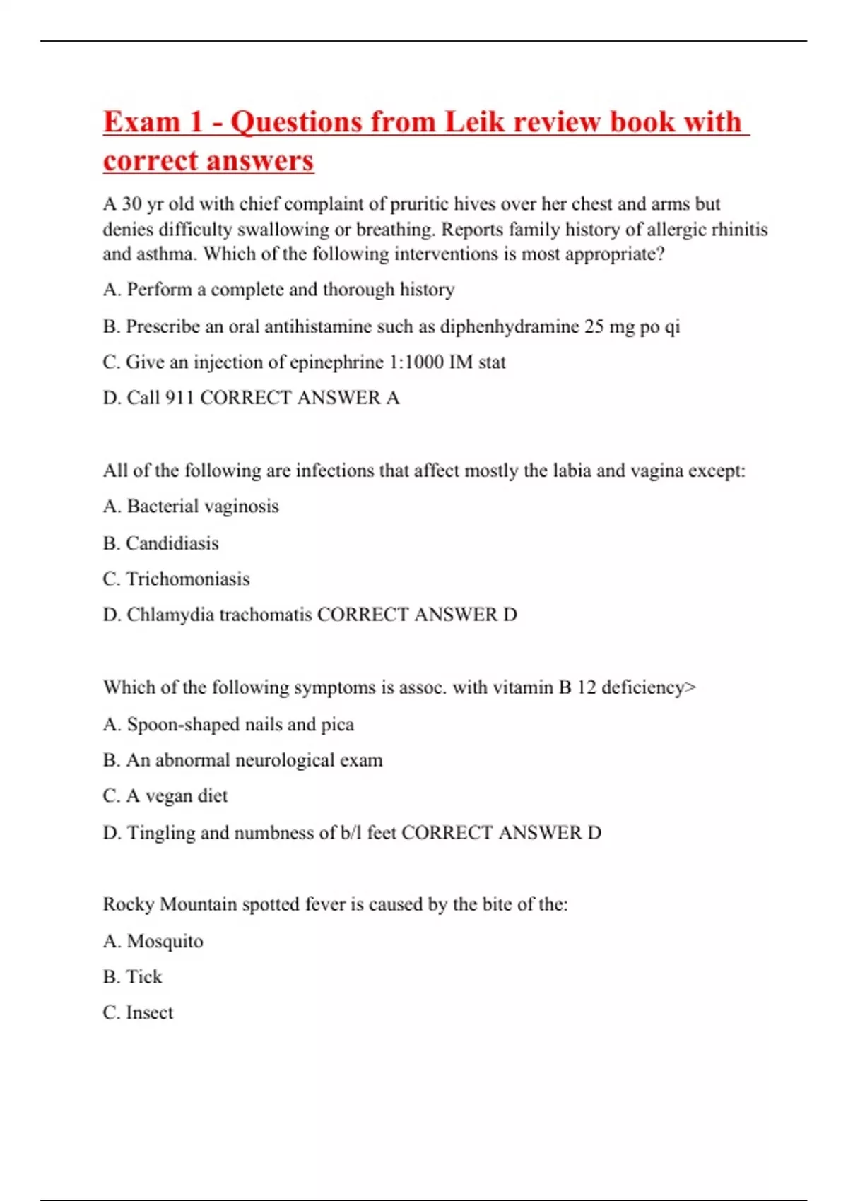 A 30 yr old with chief complaint of pruritic hives over her chest and arms but denies difficulty swallowing or breathing. Reports family history of allergic rhinitis and asthma. Which of the following interventions is most appropriate? A. Perform a complete and thorough history B. Prescribe an oral antihistamine such as diphenhydramine 25 mg po qi C. Give an injection of epinephrine 1:1000 IM stat D. Call 911 CORRECT ANSWER A All of the following are infections that affect mostly the labia and vagina except: A. Bacterial vaginosis B. Candidiasis C. Trichomoniasis D. Chlamydia trachomatis CORRECT ANSWER D Which of the following symptoms is assoc. with vitamin B 12 deficiency> A. Spoon-shaped nails and pica B. An abnormal neurological exam C. A vegan diet D. Tingling and numbness of b/l feet CORRECT ANSWER D Rocky Mountain spotted fever is caused by the bite of the: A. Mosquito B. Tick C. Insect