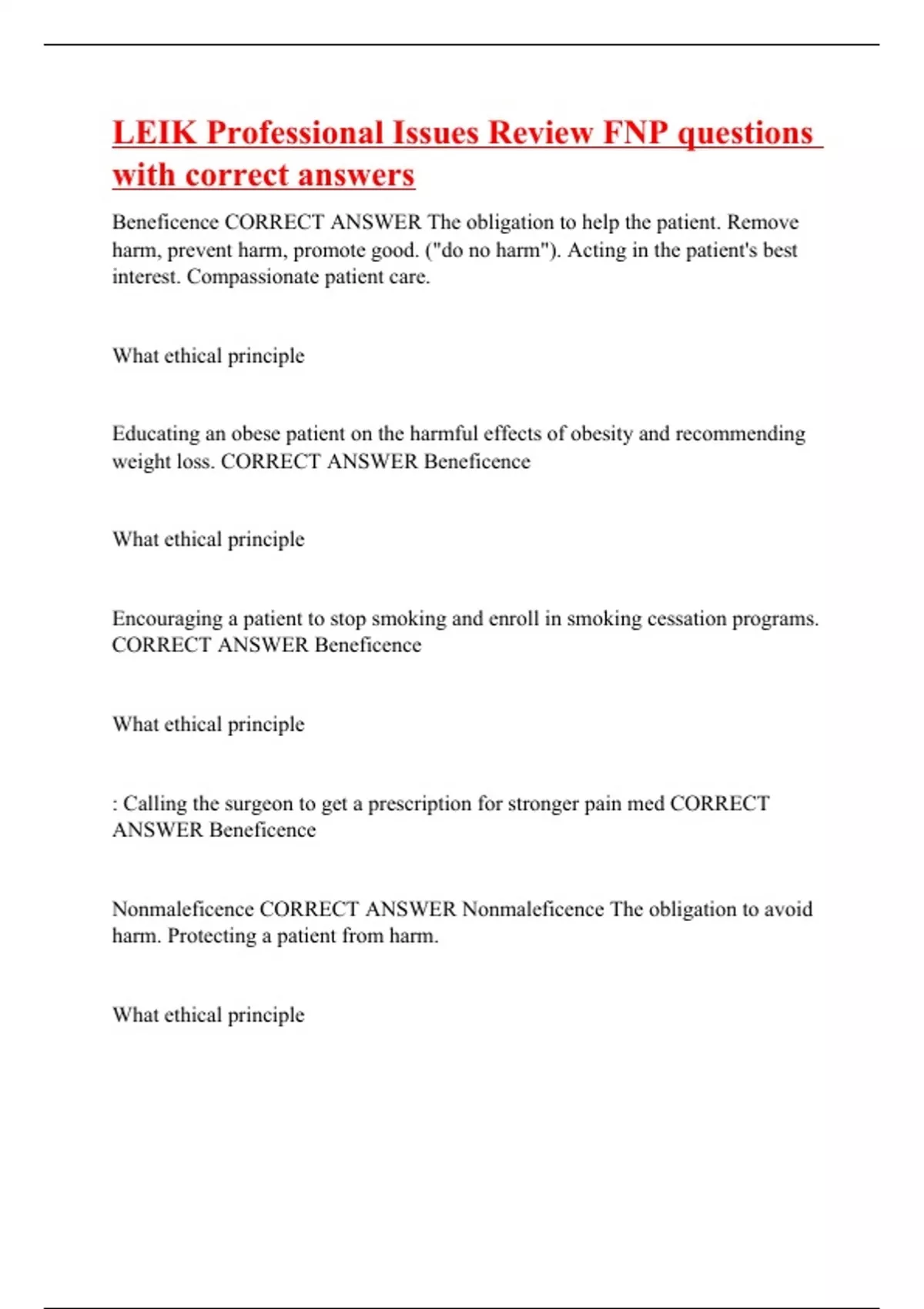 Beneficence CORRECT ANSWER The obligation to help the patient. Remove harm, prevent harm, promote good. ("do no harm"). Acting in the patient's best interest. Compassionate patient care. What ethical principle Educating an obese patient on the harmful effects of obesity and recommending weight loss. CORRECT ANSWER Beneficence What ethical principle Encouraging a patient to stop smoking and enroll in smoking cessation programs. CORRECT ANSWER Beneficence What ethical principle : Calling the surgeon to get a prescription for stronger pain med CORRECT ANSWER Beneficence Nonmaleficence CORRECT ANSWER Nonmaleficence The obligation to avoid harm. Protecting a patient from harm. What ethical principle