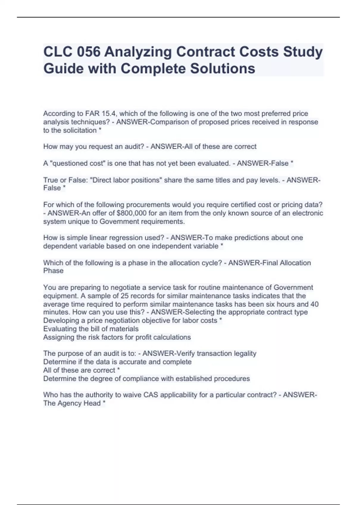 CLC 056 Analyzing Contract Costs Study Guide with Complete Solutions CLC 056 Analyzing Contract Costs Study Guide with Complete Solutions CLC 056 Analyzing Contract Costs Study Guide with Complete Solutions According to FAR 15.4, which of the following is one of the two most preferred price analysis techniques? - ANSWER-Comparison of proposed prices received in response to the solicitation * How may you request an audit? - ANSWER-All of these are correct A "questioned cost" is one that has not yet been evaluated. - ANSWER-False * True or False: "Direct labor positions" share the same titles and pay levels. - ANSWER-False * For which of the following procurements would you require certified cost or pricing data? - ANSWER-An offer of $800,000 for an item from the only known source of an electronic system unique to Government requirements. How is simple linear regression used? - ANSWER-To make predictions about one dependent variable based on one independent variable * Which of the following is a phase in the allocation cycle? - ANSWER-Final Allocation Phase You are preparing to negotiate a service task for routine maintenance of Government equipment. A sample of 25 records for similar maintenance tasks indicates that the average time required to perform similar maintenance tasks has been six hours and 40 minutes. How can you use this? - ANSWER-Selecting the appropriate contract type