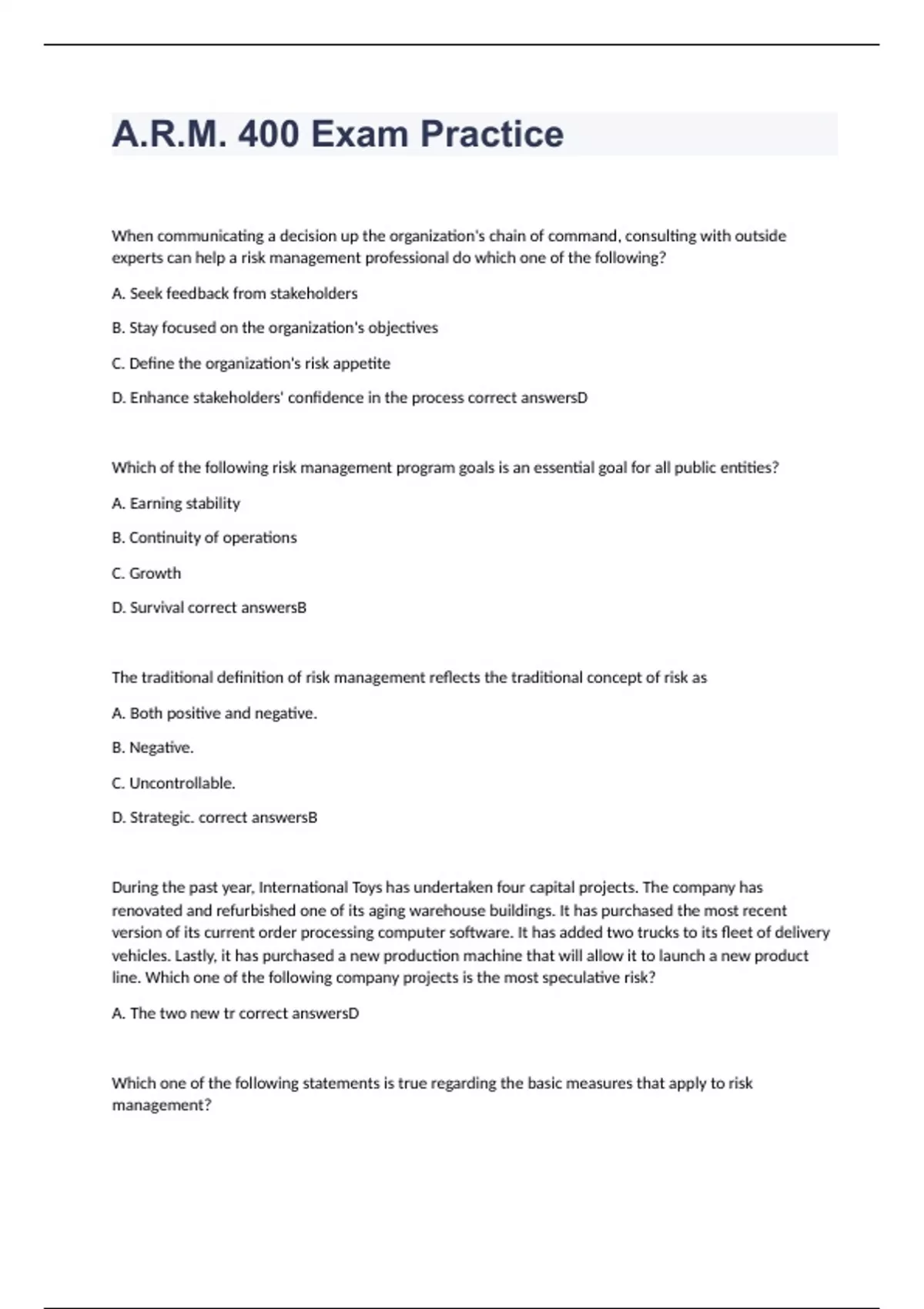 When communicating a decision up the organization's chain of command, consulting with outside experts can help a risk management professional do which one of the following? A. Seek feedback from stakeholders B. Stay focused on the organization's objectives C. Define the organization's risk appetite D. Enhance stakeholders' confidence in the process D Which of the following risk management program goals is an essential goal for all public entities? A. Earning stability B. Continuity of operations C. Growth D. Survival B The traditional definition of risk management reflects the traditional concept of risk as A. Both positive and negative. B. Negative. C. Uncontrollable. D. Strategic. B During the past year, International Toys has undertaken four capital projects. The company has renovated and refurbished one of its aging warehouse buildings. It has purchased the most recent version of its current order processing computer software. It has added two trucks to its fleet of delivery vehicles. Lastly, it has purchased a new production machine that will allow it to launch a new product line. Which one of the following company projects is the most speculative risk? A. The two new tr D