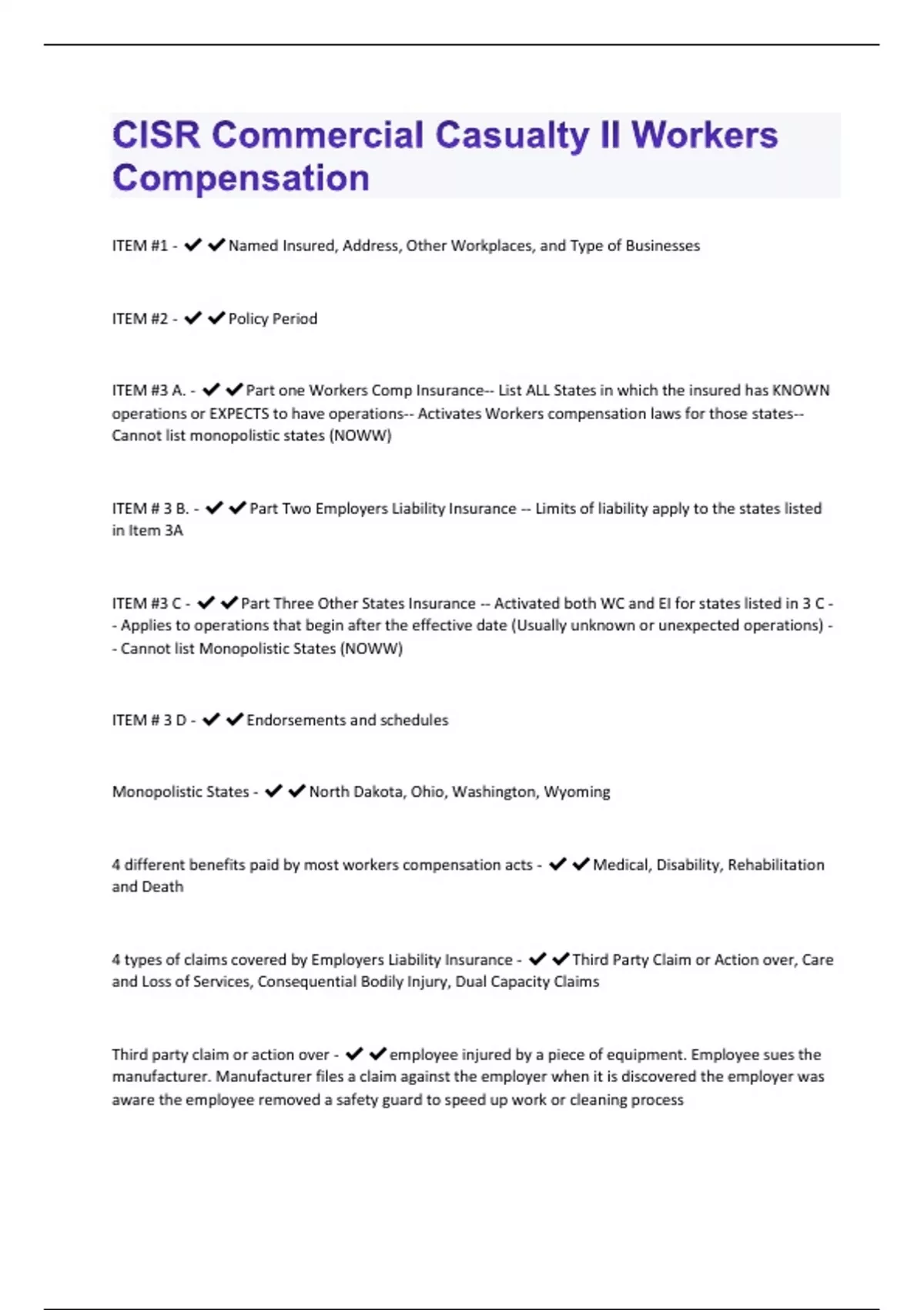 ITEM #1 - Named Insured, Address, Other Workplaces, and Type of Businesses ITEM #2 - Policy Period ITEM #3 A. - Part one Workers Comp Insurance-- List ALL States in which the insured has KNOWN operations or EXPECTS to have operations-- Activates Workers compensation laws for those states-- Cannot list monopolistic states (NOWW) ITEM # 3 B. - Part Two Employers Liability Insurance -- Limits of liability apply to the states listed in Item 3A ITEM #3 C - Part Three Other States Insurance -- Activated both WC and EI for states listed in 3 C - - Applies to operations that begin after the effective date (Usually unknown or unexpected operations) - - Cannot list Monopolistic States (NOWW) ITEM # 3 D - Endorsements and schedules Monopolistic States - North Dakota, Ohio, Washington, Wyoming 4 different benefits paid by most workers compensation acts - Medical, Disability, Rehabilitation and Death 4 types of claims covered by Employers Liability Insurance - Third Party Claim or Action over, Care and Loss of Services, Consequential Bodily Injury, Dual Capacity Claims Third party claim or action over - employee injured by a piece of equipment. Employee sues the manufacturer. Manufacturer files a claim against the employer when it is discovered the employer was aware the employee removed a safety guard to speed up work or cleaning processCare and Loss of Services -Dependents need care and services the injured parent can no longer provide. Also, spouse may sue for loss of consortium