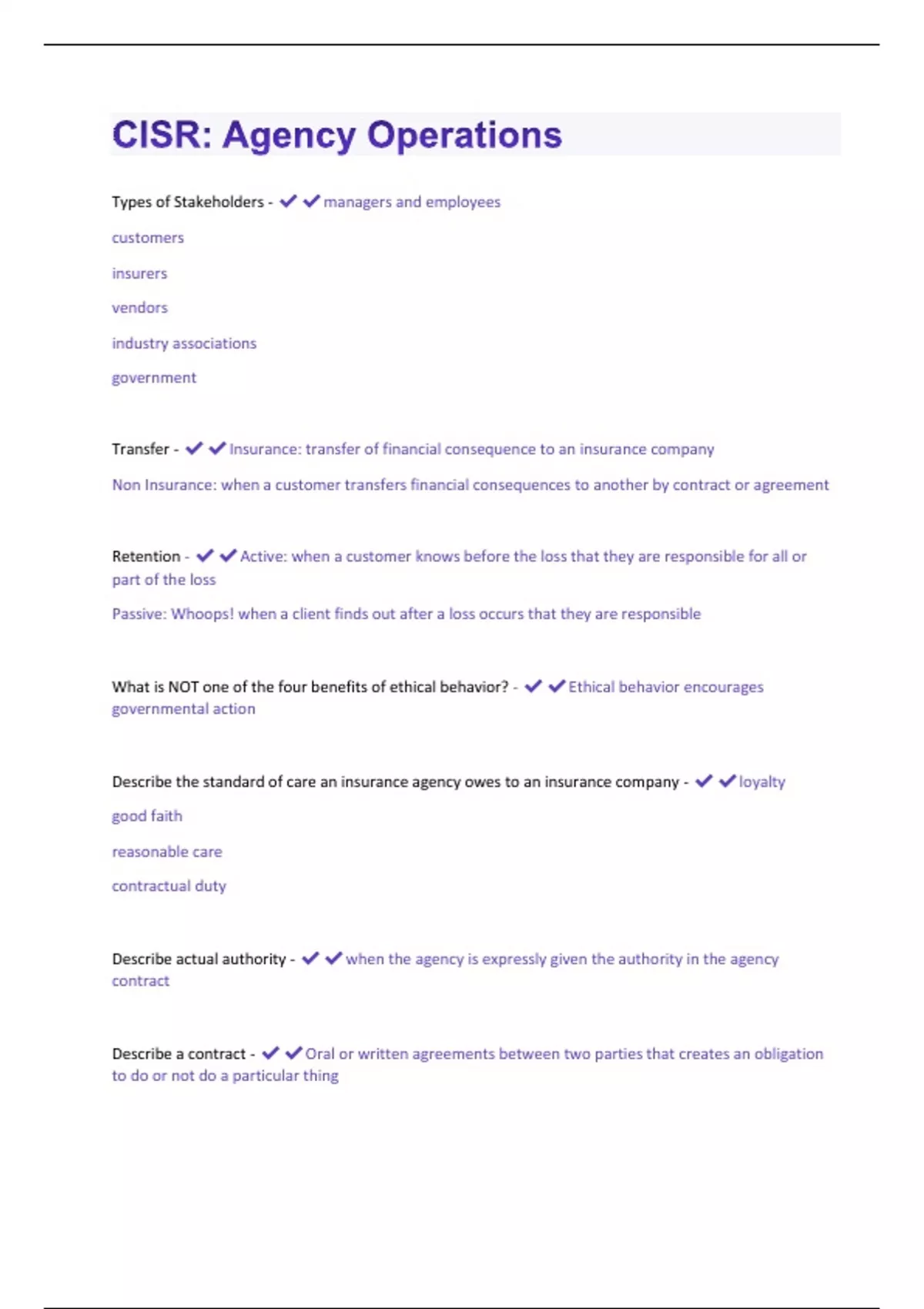 Types of Stakeholders - managers and employees customers insurers vendors industry associations government Transfer - Insurance: transfer of financial consequence to an insurance company Non Insurance: when a customer transfers financial consequences to another by contract or agreement Retention - Active: when a customer knows before the loss that they are responsible for all or part of the loss Passive: Whoops! when a client finds out after a loss occurs that they are responsible What is NOT one of the four benefits of ethical behavior? - Ethical behavior encourages governmental action Describe the standard of care an insurance agency owes to an insurance company - loyalty good faith reasonable care contractual duty Describe actual authority -when the agency is expressly given the authority in the agency contract Describe a contract - Oral or written agreements between two parties that creates an obligation to do or not do a particular thingWhat are the four benefits of ethical behavior? - To be recognized as a knowledgeable insurance professional within the community To gain public trust and confidence To avoid government regulation To enhance credibility with customers and companies What is the risk management process? - Risk Identification Risk analysis Risk control Risk finance Risk administration