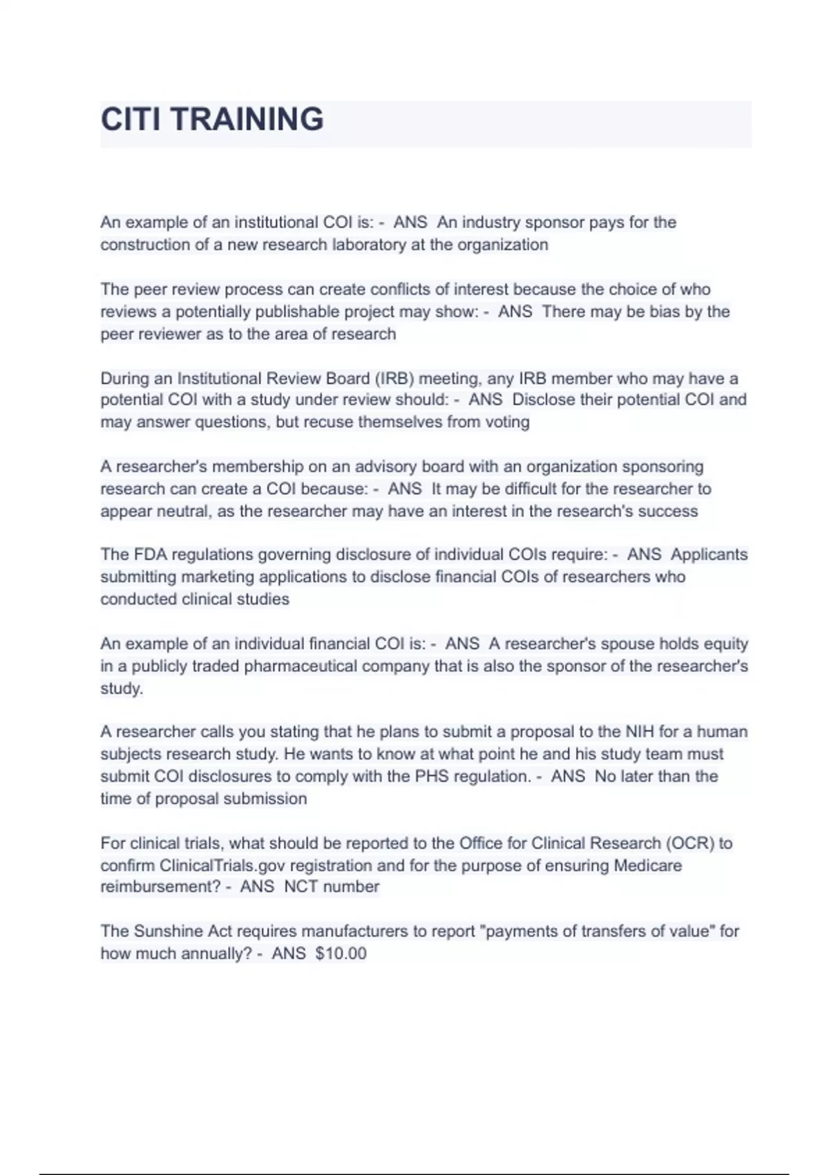 CITI TRAINING COMPLETE QUESTIONS WITH 100% VERIFIED QUESTIONS An example of an institutional COI is: - ANS An industry sponsor pays for the construction of a new research laboratory at the organization The peer review process can create conflicts of interest because the choice of who reviews a potentially publishable project may show: - ANS There may be bias by the peer reviewer as to the area of research During an Institutional Review Board (IRB) meeting, any IRB member who may have a potential COI with a study under review should: - ANS Disclose their potential COI and may answer questions, but recuse themselves from voting A researcher's membership on an advisory board with an organization sponsoring research can create a COI because: - ANS It may be difficult for the researcher to appear neutral, as the researcher may have an interest in the research's success The FDA regulations governing disclosure of individual COIs require: - ANS Applicants submitting marketing applications to disclose financial COIs of researchers who conducted clinical studies An example of an individual financial COI is: - ANS A researcher's spouse holds equity in a publicly traded pharmaceutical company that is also the sponsor of the researcher's study. A researcher calls you stating that he plans to submit a proposal to the NIH for a human subjects research study. He wants to know at what point he and his study team must submit COI disclosures to comply with the PHS regulation. - ANS No later than the time of proposal submission For clinical trials, what should be reported to the Office for Clinical Research (OCR) to confirm ClinicalT registration and for the purpose of ensuring Medicare reimbursement? - ANS NCT number The Sunshine Act requires manufacturers to report "payments of transfers of value" for how much annually? - ANS $10.00