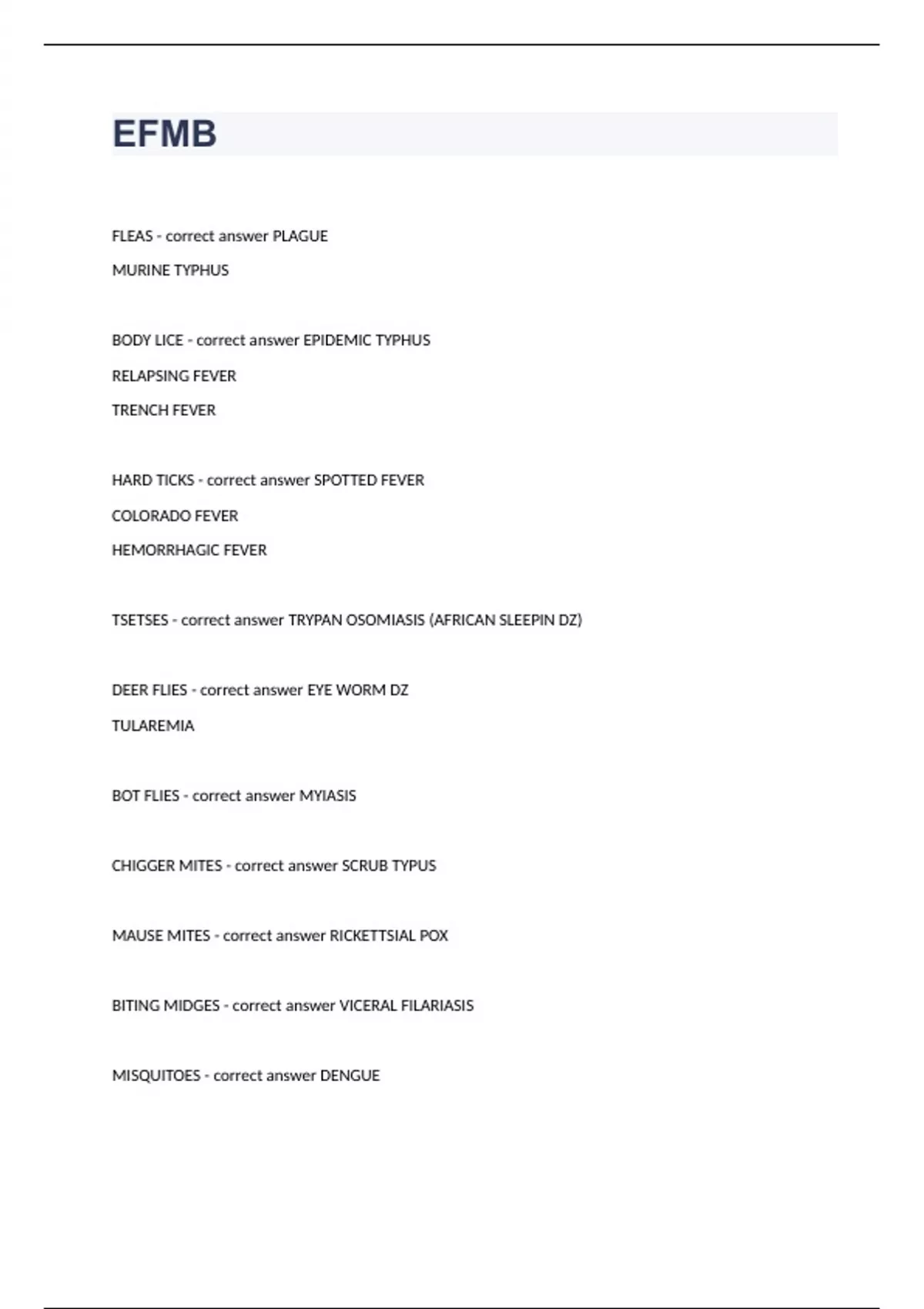 EFMB FLEAS - correct answer PLAGUE MURINE TYPHUS BODY LICE - correct answer EPIDEMIC TYPHUS RELAPSING FEVER TRENCH FEVER HARD TICKS - correct answer SPOTTED FEVER COLORADO FEVER HEMORRHAGIC FEVER TSETSES - correct answer TRYPAN OSOMIASIS (AFRICAN SLEEPIN DZ) DEER FLIES - correct answer EYE WORM DZ TULAREMIA BOT FLIES - correct answer MYIASIS CHIGGER MITES - correct answer SCRUB TYPUS MAUSE MITES - correct answer RICKETTSIAL POX BITING MIDGES - correct answer VICERAL FILARIASIS MISQUITOES - correct answer DENGUE YELLOW FEVER VIRAL ENCEPHALITIS MALERIA SAND FLIES - correct answer LEISHMANIASIS SAND FLY FEVER BAITENELLOSIS IODINE TABLES FOR 5 GALLONS - correct answer 40 TABLETS IODINE TABLETS FOR 40OZ - correct answer 2 TABS IODINETABS FOR 70 OZ AND 100 OZ - correct answer 70OZ=4 TABS 100OZ=6 TABS WHAT IS THE MOST SIGNIFICANT SIGN OF HEAT STROKE? - correct answer BODY CORE TEMP OF 106F OR RECTAL TEMP EXCEEDING 108F WHAT DOES A NET BULB-GLOBE TEMP KIT CONTAIN - correct answer WET BULB THERMOMETER BLACK GLOBE THERMOMETER DRY BULB THERMOMETER WHAT ARE THE TYPES OF NOISE? - correct answer STEADY-- GENERATOR, HELICOPTER IMPULSE-- IE IMPACT NOISE PHYSIOLOGICAL RESPONES TO HEAT STRESS IMPROVE IN? - correct answer 10-14 DAYS MOST COMMON FOOD BOURNE PATHOGENS - correct answer L- HISTERIA E- E.COLI