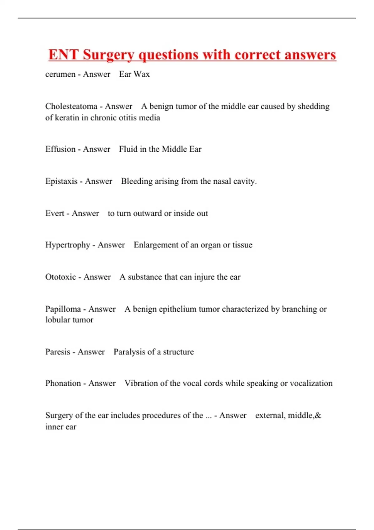 cerumen - Answer Ear Wax Cholesteatoma - Answer A benign tumor of the middle ear caused by shedding of keratin in chronic otitis media Effusion - Answer Fluid in the Middle Ear Epistaxis - Answer Bleeding arising from the nasal cavity. Evert - Answer to turn outward or inside out Hypertrophy - Answer Enlargement of an organ or tissue Ototoxic - Answer A substance that can injure the ear Papilloma - Answer A benign epithelium tumor characterized by branching or lobular tumor Paresis - Answer Paralysis of a structure