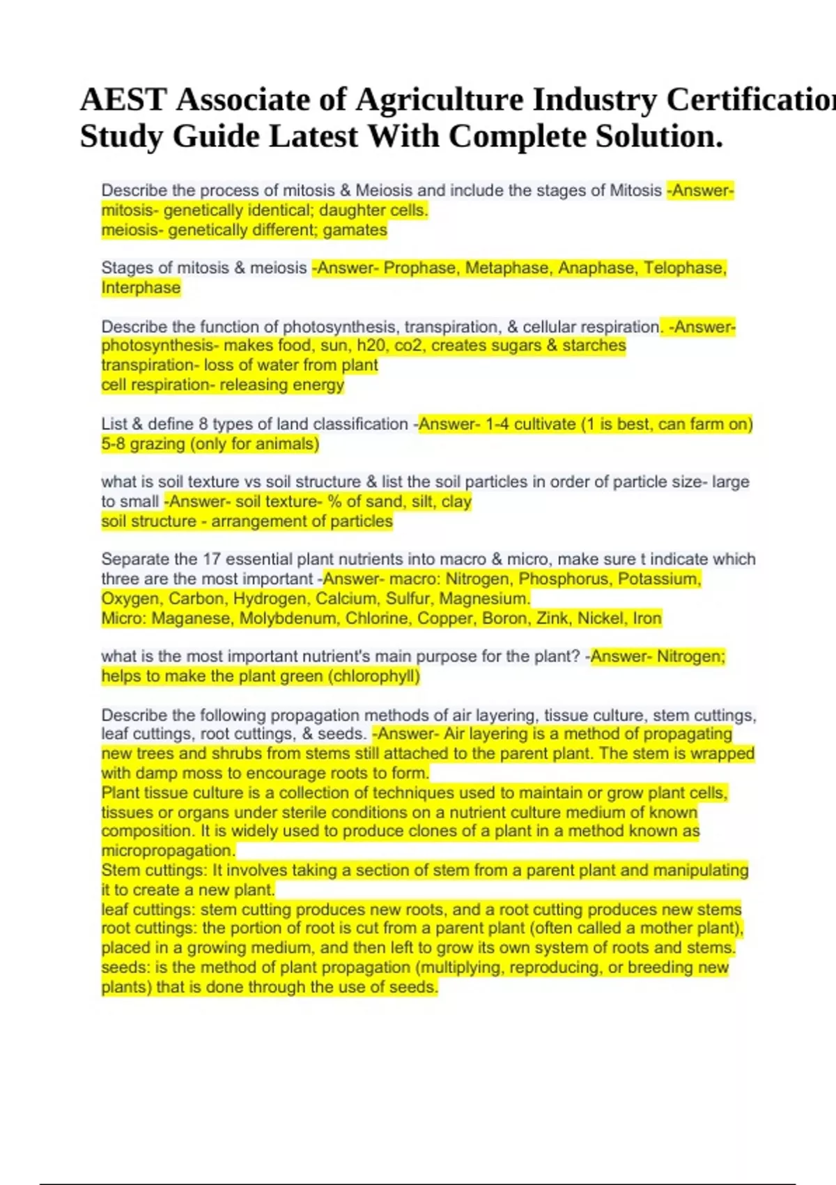 AEST Associate of Agriculture Industry Certification Study Guide Latest With Complete Solution. Describe the process of mitosis & Meiosis and include the stages of Mitosis -Answermitosis- genetically identical; daughter cells. meiosis- genetically different; gamates Stages of mitosis & meiosis -Answer- Prophase, Metaphase, Anaphase, Telophase, Interphase Describe the function of photosynthesis, transpiration, & cellular respiration. -Answerphotosynthesis- makes food, sun, h20, co2, creates sugars & starches transpiration- loss of water from plant cell respiration- releasing energy List & define 8 types of land classification -Answer- 1-4 cultivate (1 is best, can farm on) 5-8 grazing (only for animals) what is soil texture vs soil structure & list the soil particles in order of particle size- large to small -Answer- soil texture- % of sand, silt, clay soil structure - arrangement of particles Separate the 17 essential plant nutrients into macro & micro, make sure t indicate which three are the most important -Answer- macro: Nitrogen, Phosphorus, Potassium, Oxygen, Carbon, Hydrogen, Calcium, Sulfur, Magnesium. Micro: Maganese, Molybdenum, Chlorine, Copper, Boron, Zink, Nickel, Iron what is the most important nutrient's main purpose for the plant? -Answer- Nitrogen; helps to make the plant green (chlorophyll) Describe the following propagation methods of air layering, tissue culture, stem cuttings, leaf cuttings, root cuttings, & seeds. -Answer- Air layering is a method of propagating new trees and shrubs from stems still attached to the parent plant. The stem is wrapped with damp moss to encourage roots to form. Plant tissue culture is a collection of techniques used to maintain or grow plant cells, tissues or organs under sterile conditions on a nutrient culture medium of known composition. It is widely used to produce clones of a plant in a method known as micropropagation. Stem cuttings: It involves taking a section of stem from a parent plant and manipulating it to create a new plant. leaf cuttings: stem cutting produces new roots, and a root cutting produces new stems root cuttings: the portion of root is cut from a parent plant (often called a mother plant), placed in a growing medium, and then left to grow its own system of roots and stems. seeds: is the method of plant propagation (multiplying, reproducing, or breeding new plants) that is done through the use of seeds. AEST Associate of Agriculture Industry Certification Study Guide Latest With Complete Solution. What is germination vs propagation -Answer- germination- seed sprouts propagation- growing plants Describe asexual plant propagation & sexual plant propagation. -Answer- asexual: cuttings, layering, division, buddings, & grafting sexual:involves the union of the pollen (male) with the egg (female) to produce a seed Breakdown the spermatophyta category of plants & describe each sub level. -AnswerGymnosperm- cones, naked seeds Angiosperm- Flower parts (monocotyledons- first leaf, parallel veins, non-woody flowers * 3) (dicotyledons- netted veins, woody, flowers *4 or 5). describe the vascular system of a monocotyledon & dicotyledon -Answer- monocotvascular bundles dicot- organized What are the 3 vegetative parts of the plant & what are their main function? -Answerleaf- photosynthesis stem-support root- water/ nutrients.
